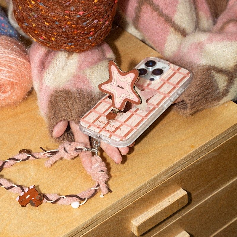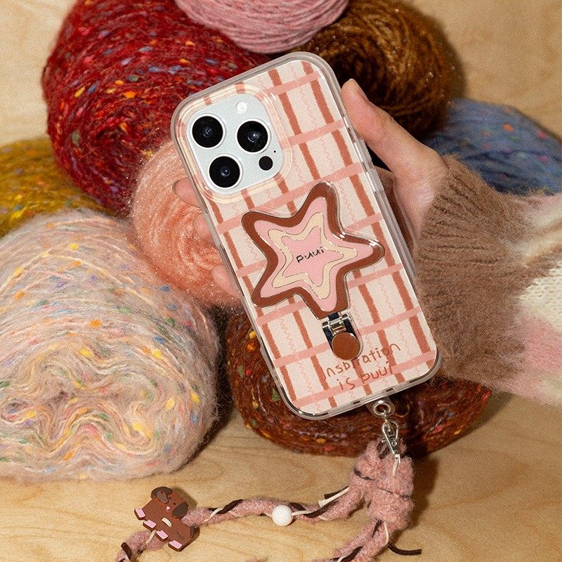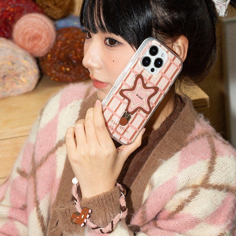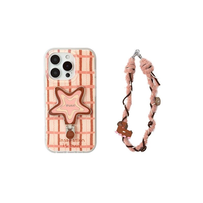 Puui原创星星哒苹果秋冬格纹手机壳16promax链条全包保护壳苹果15promax带支架17pro翻盖镜面支架手机壳