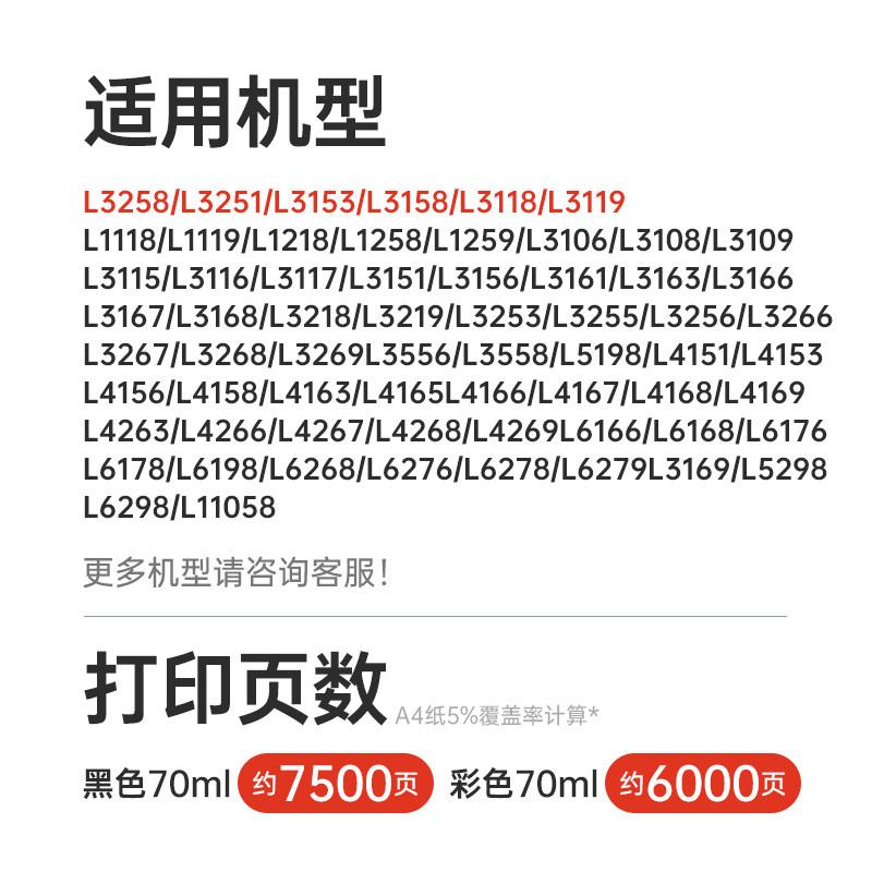 泰森原装适用爱普生004墨水L3118补充L3119填充L1258颜料L3153彩墨3158彩色打印机L3218黑色墨水3258 L3256