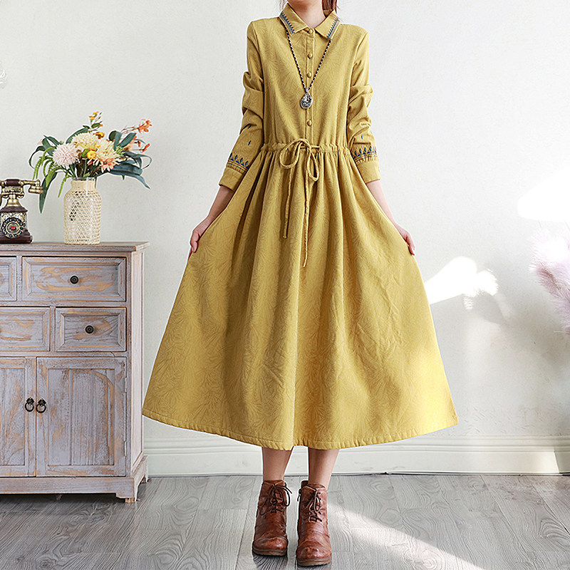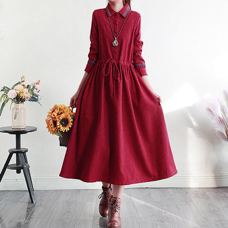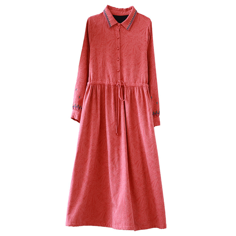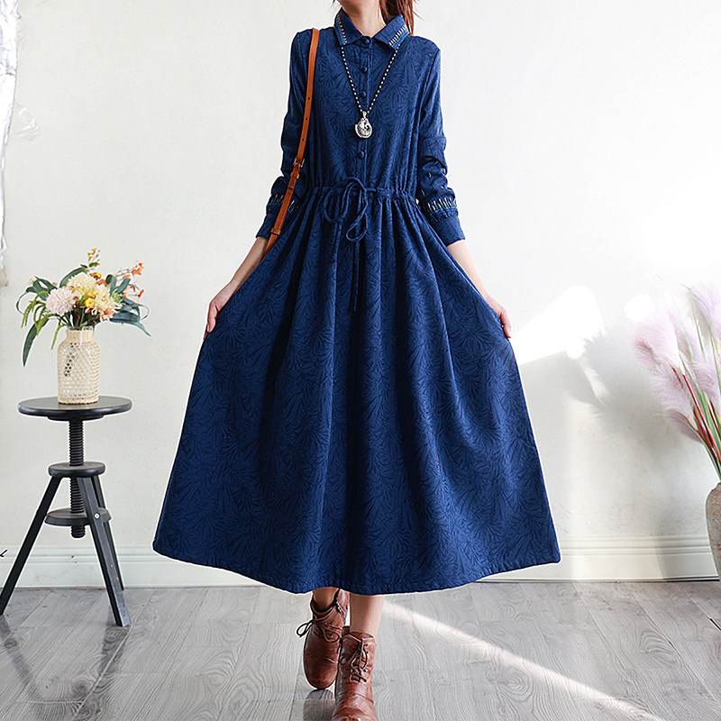 文艺范刺绣加绒连衣裙女冬季加厚暖提花系带长款宽松长裙子衬衫领
