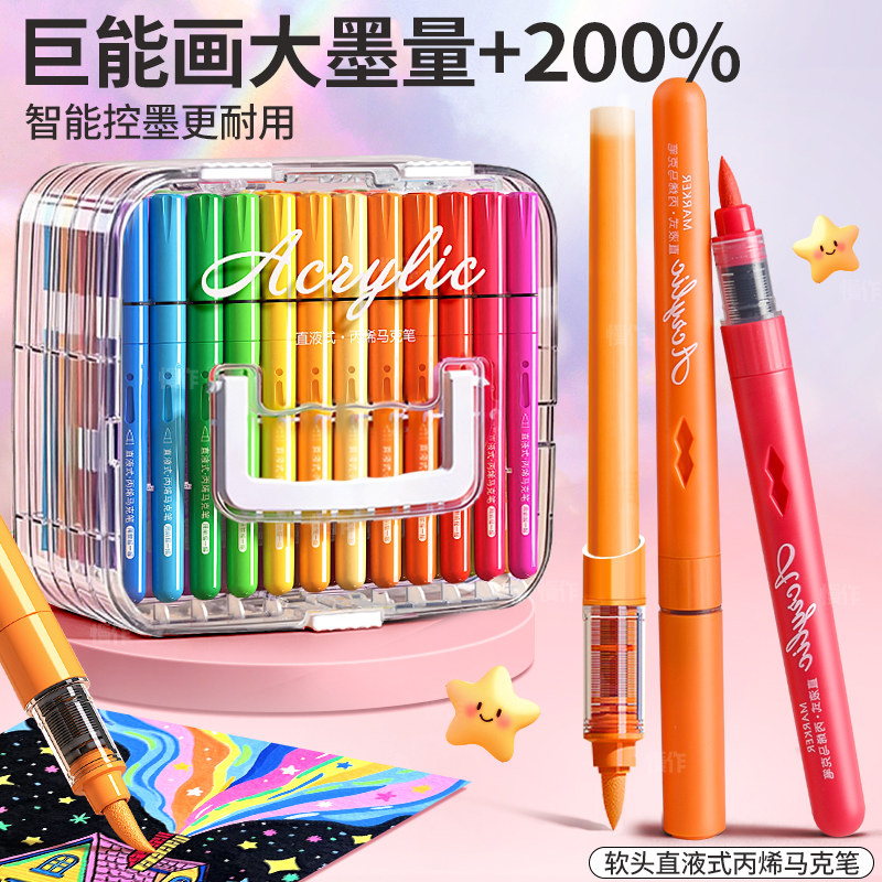 直液式丙烯马克笔软头小学生美术专用水彩笔儿童颜色笔可水洗24色画笔不透色48绘画可叠色彩色笔36水性丙烯笔