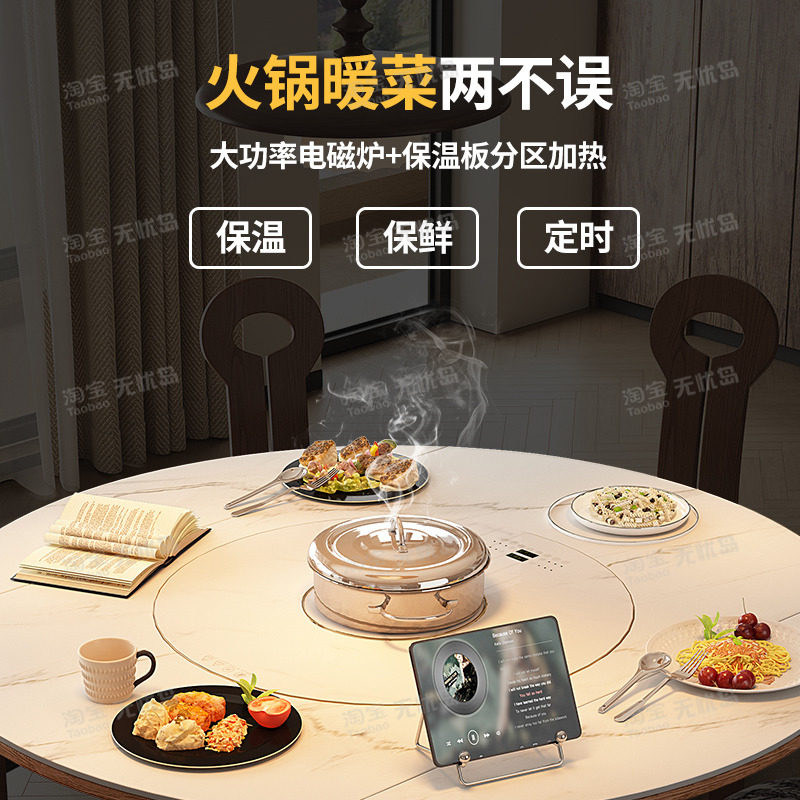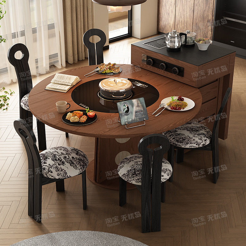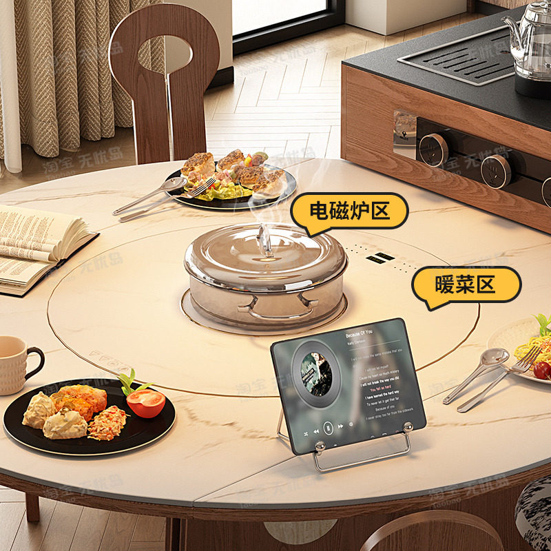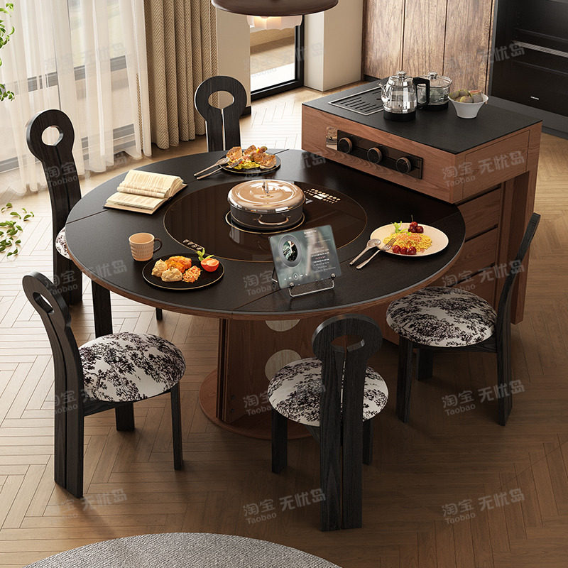 岩板餐桌椅组合高端实木带转盘多功能家用可伸缩现代简约圆形饭桌