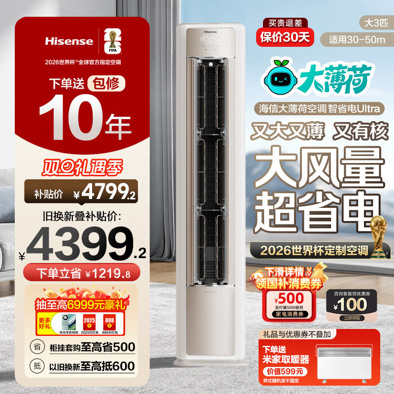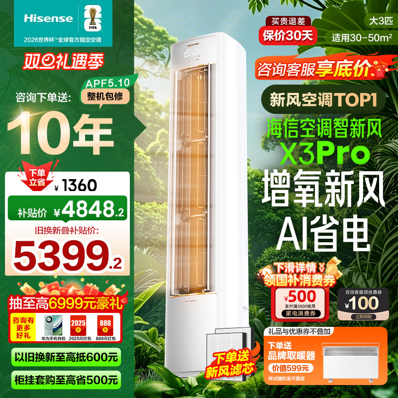 海信空调智新风X3Pro新风大3匹家用立式国补一级能效客厅柜式柜机