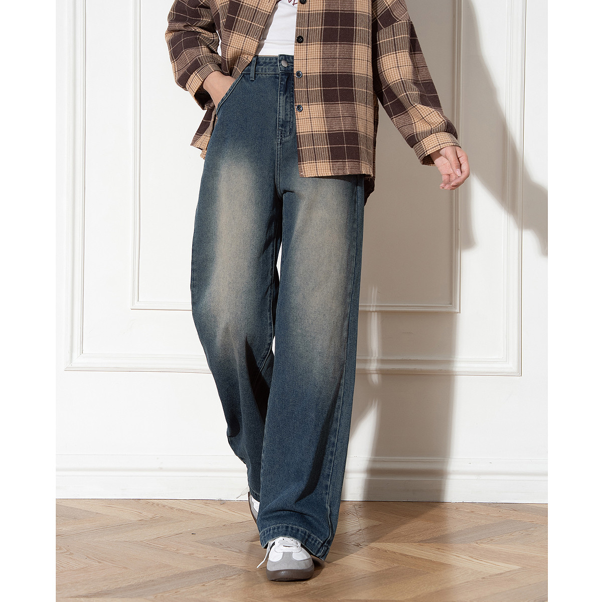 三福牛仔长裤2025新款冬季磨毛阔腿裤复古深色宽松裤子女装512304