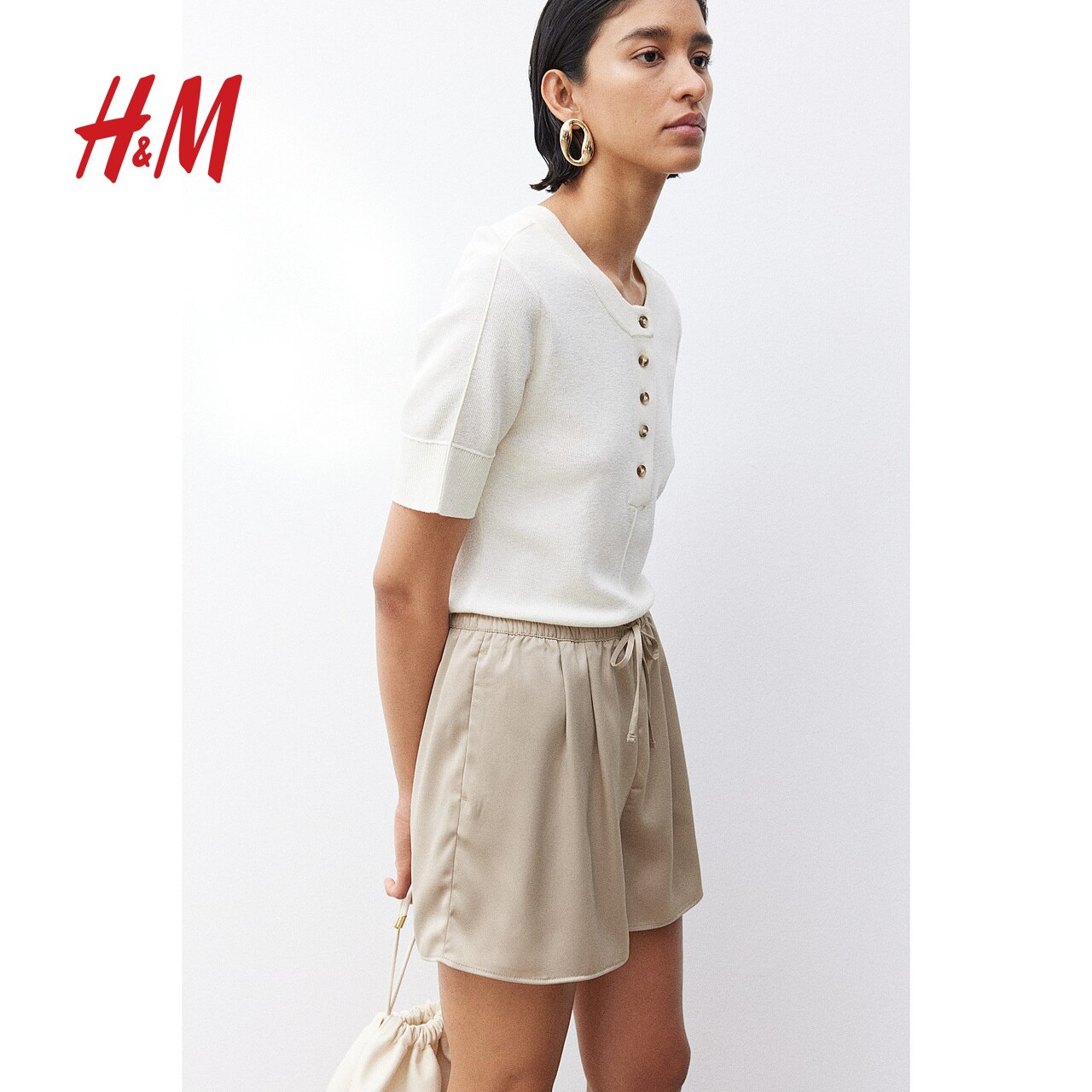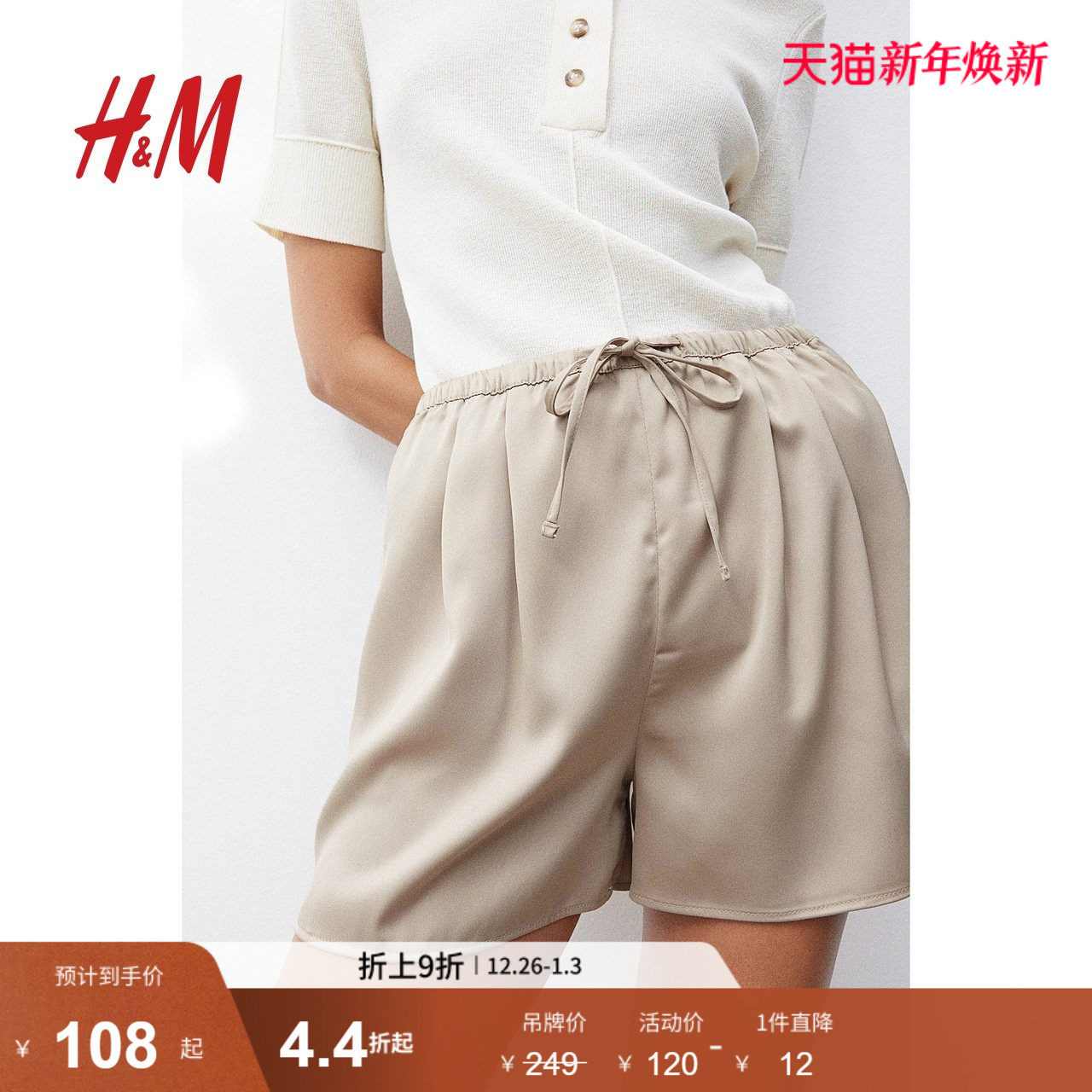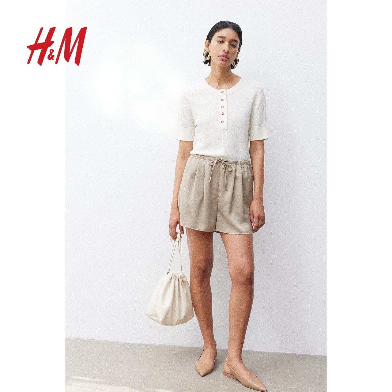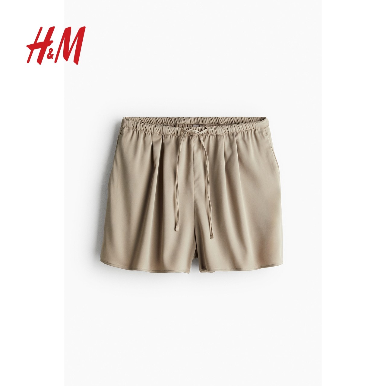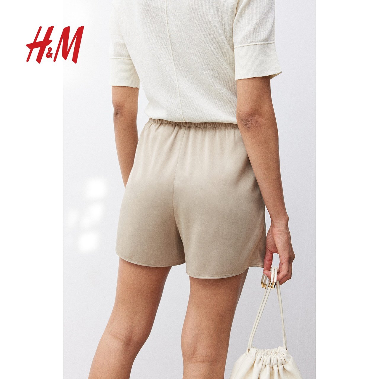 HM女装裤子冬季潮流时尚绿色舒适松紧腰高腰休闲短裤1237043