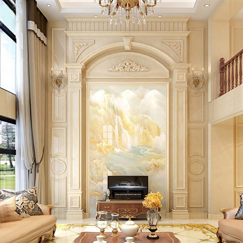复式楼微晶石电视背景墙瓷砖客厅别墅挑空大理石岩板影视墙装饰