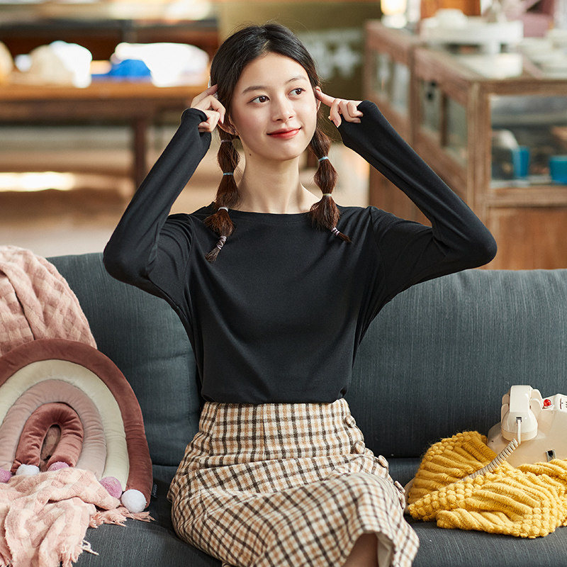 唐狮秋冬纯色打底衫女内搭黑白色长袖T恤早秋修身百搭简约ins上衣