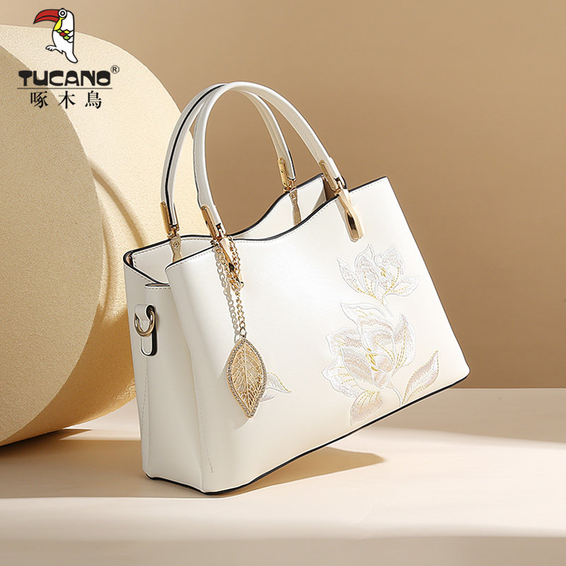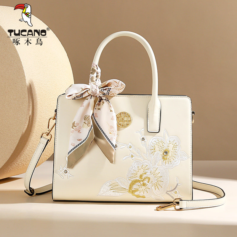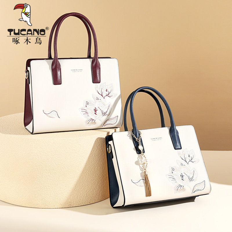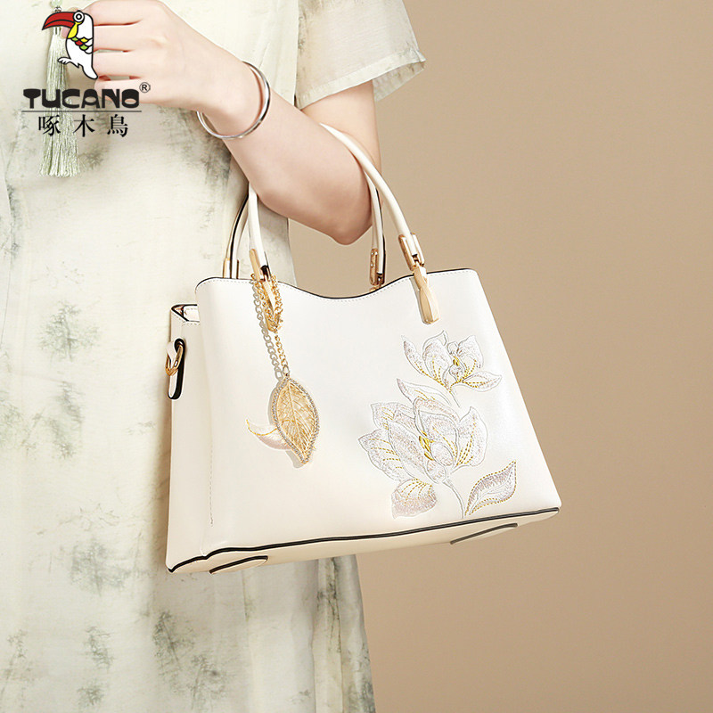 啄木鸟大容量包包女2025新款高级感轻奢真皮刺绣送妈妈手提包国风