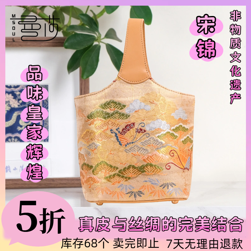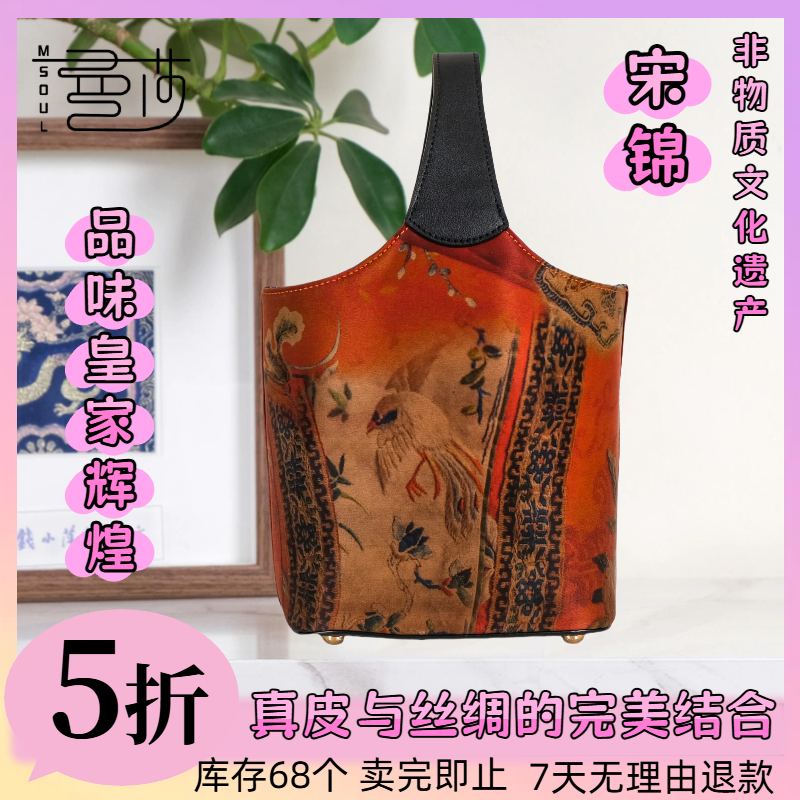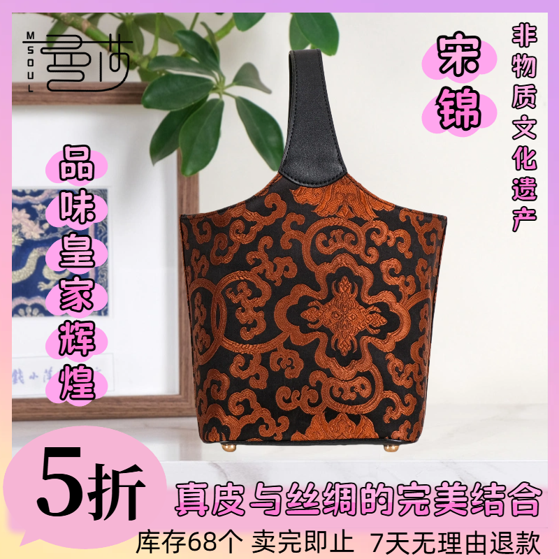 中国风宋锦香云纱手提单肩斜挎刺绣真丝牛皮