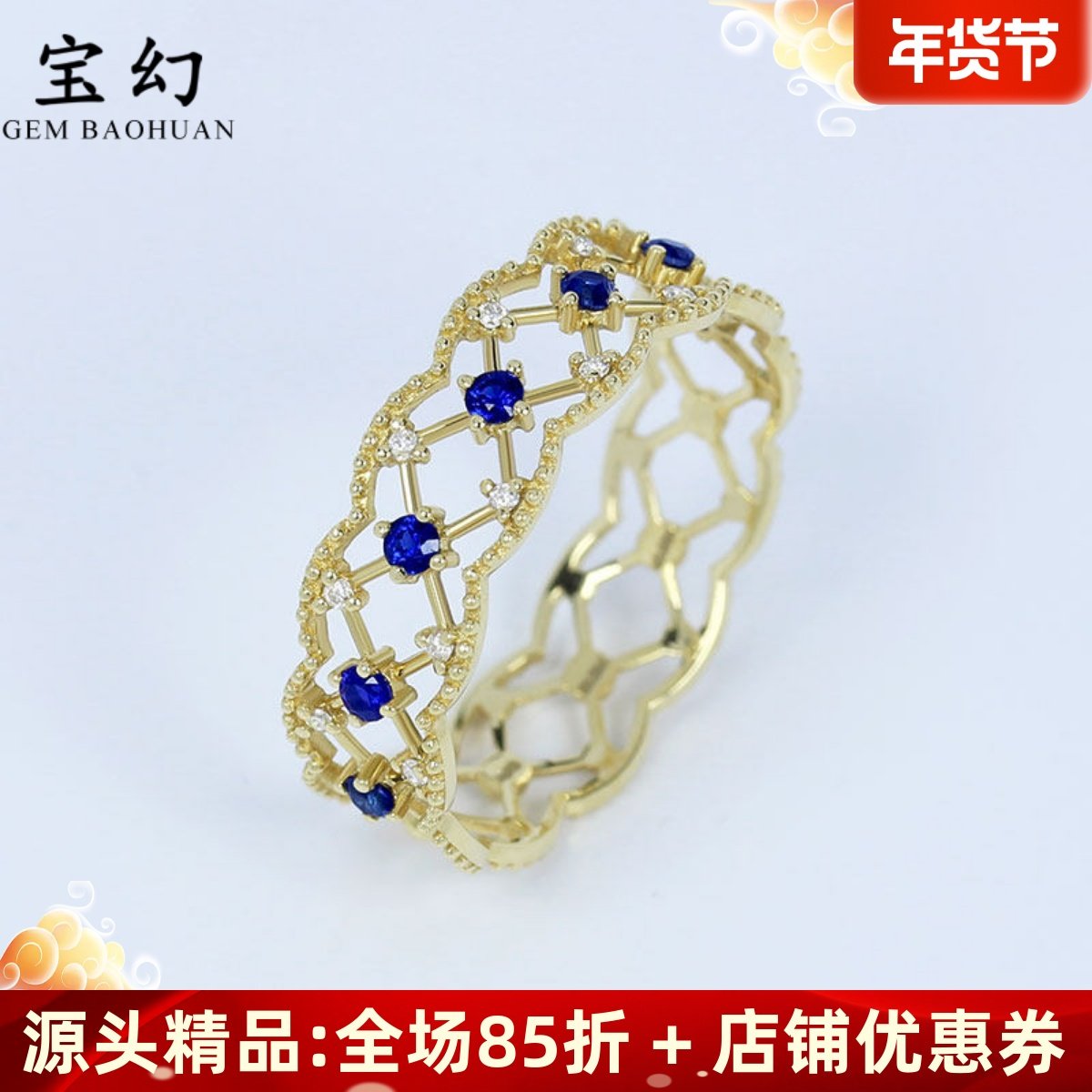 加厚18k黄金天然蓝宝石钻石戒指 精美彩宝复古镂空蕾丝珠边女指环