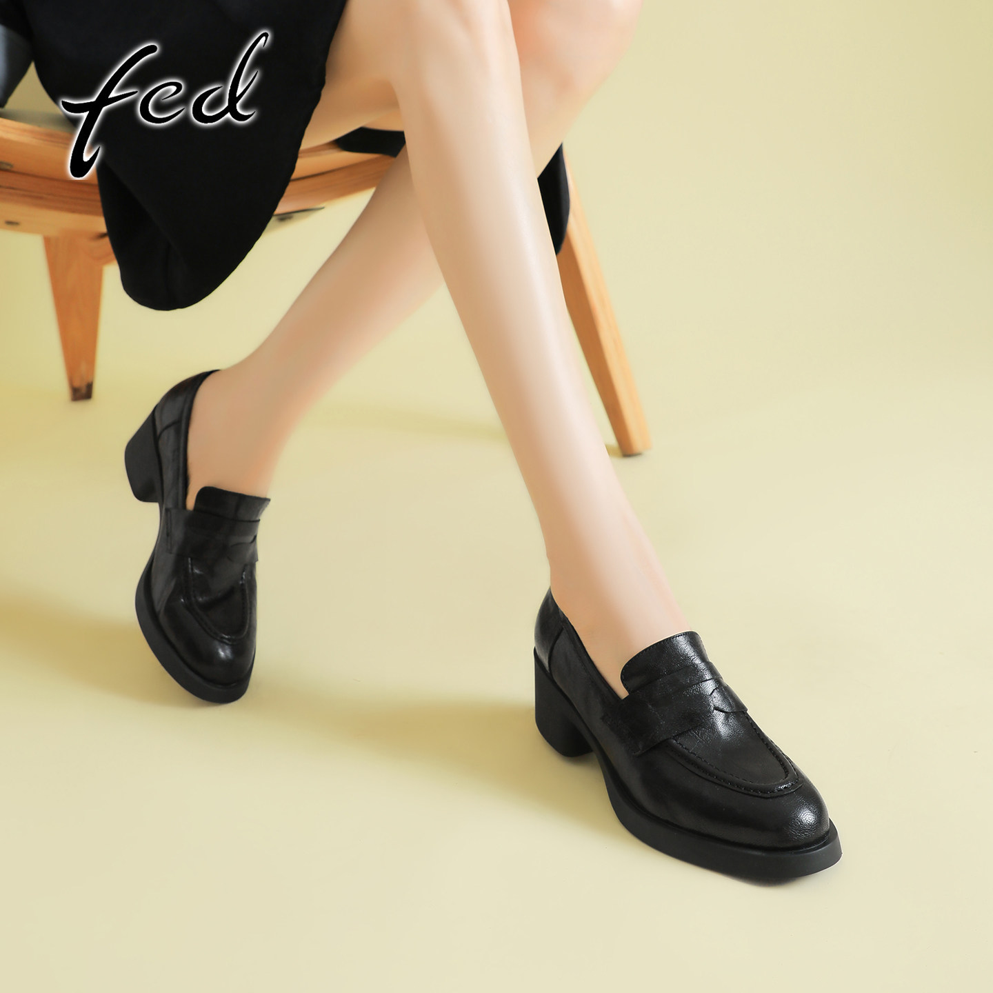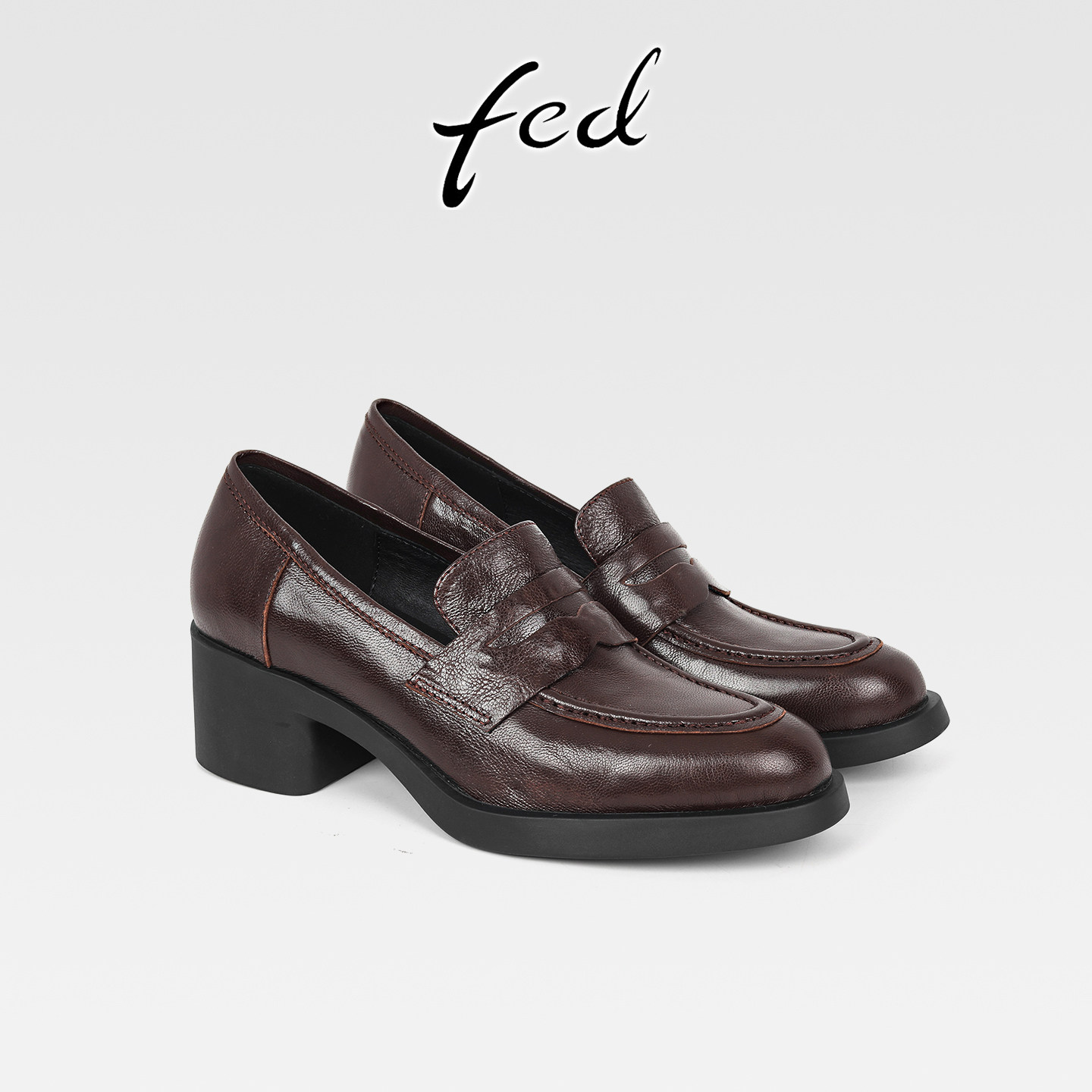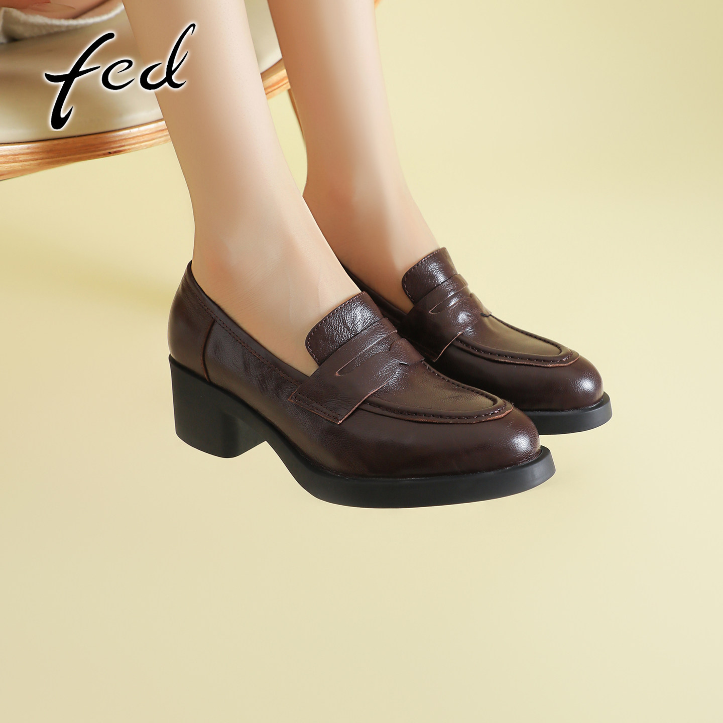 fed真皮粗跟厚底乐福鞋女复古小皮鞋一脚蹬圆头高跟深口通勤单鞋