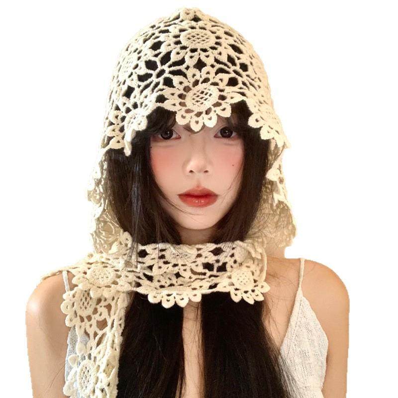 钩花蕾丝镂空帽子女民族风旅游穿搭拍照显脸小套头帽针织包头帽