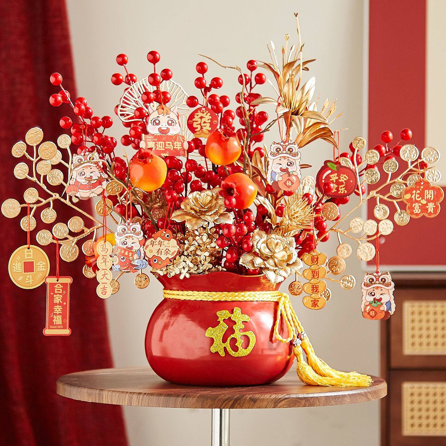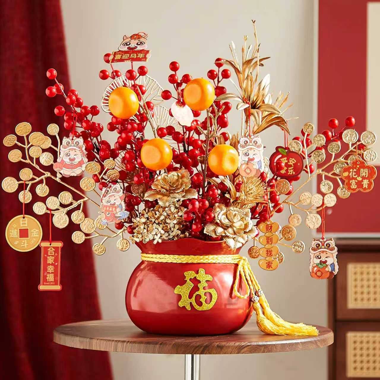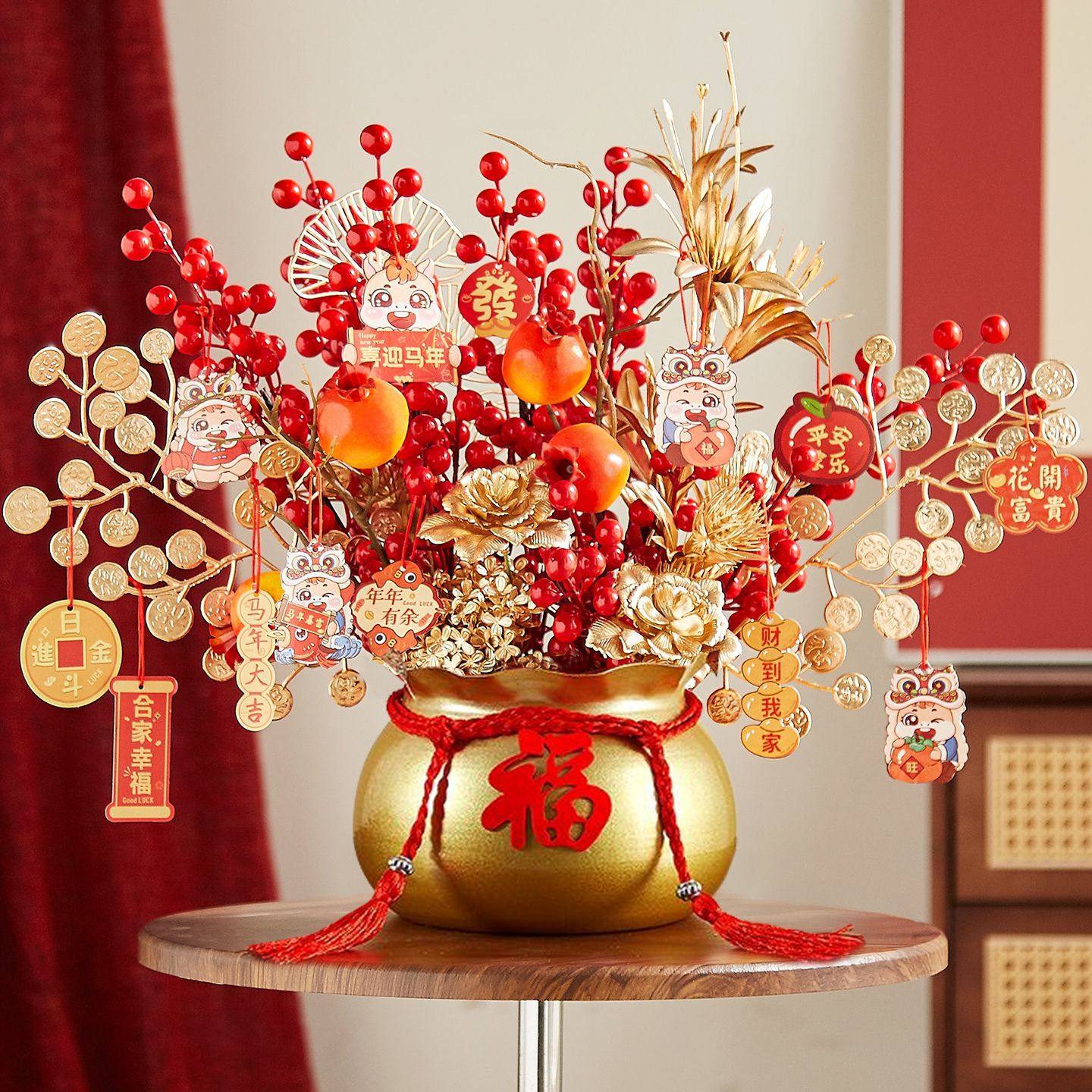 年宵花福桶发财果摆件过年乔迁之喜装饰用品新居家布置红果仿真花