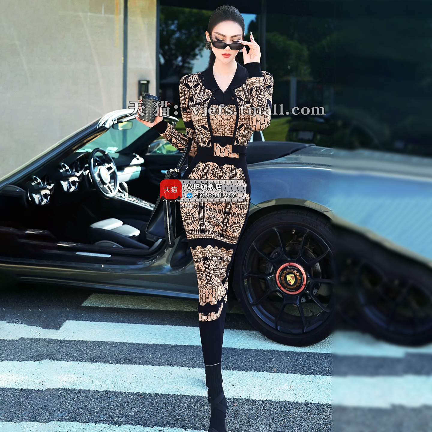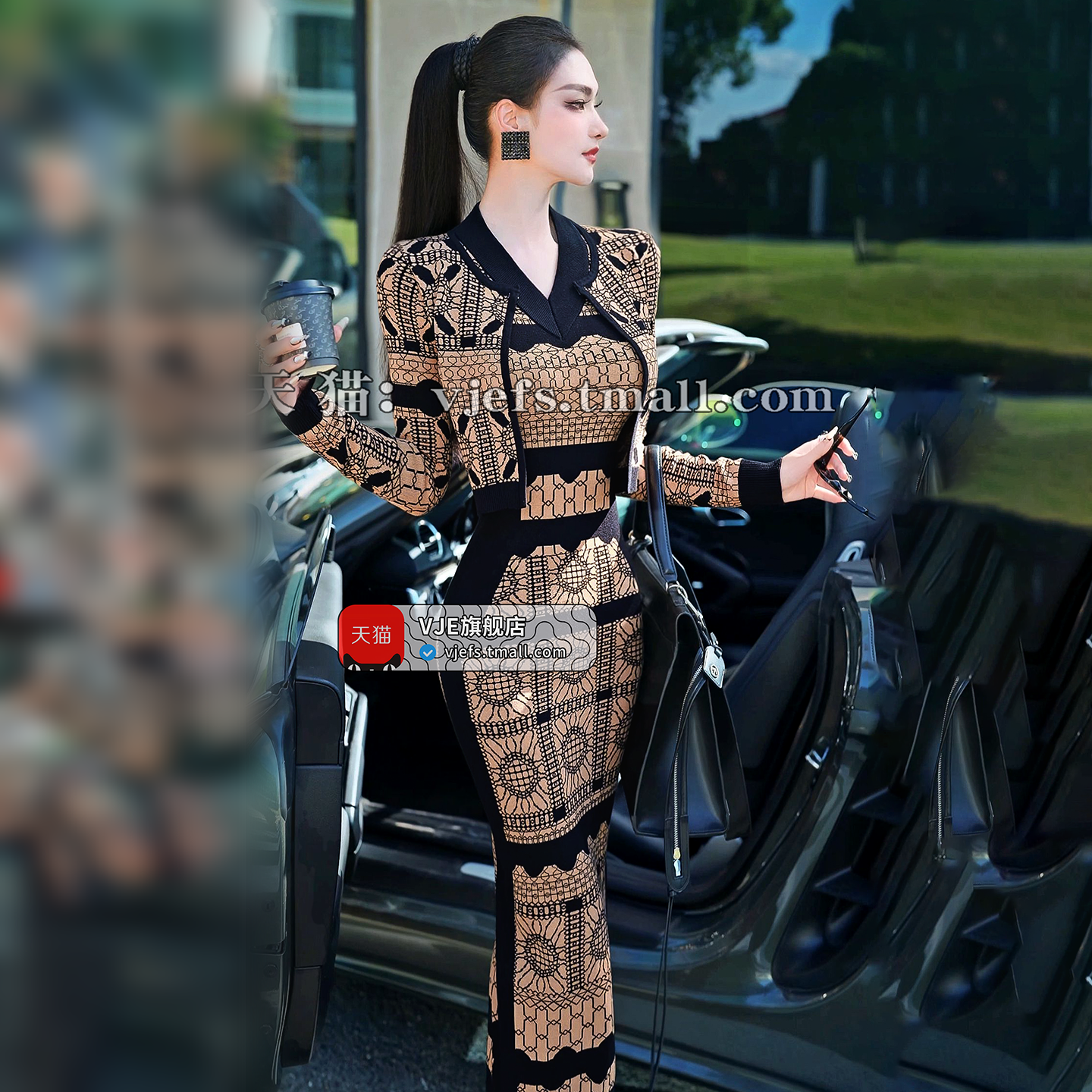 VJE秋冬欧美女王范减龄修身连衣裙2025新款假两件披肩针织长裙