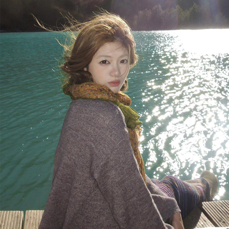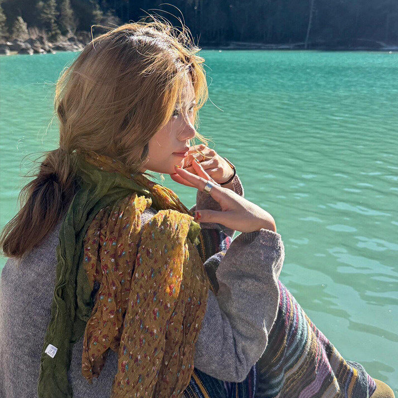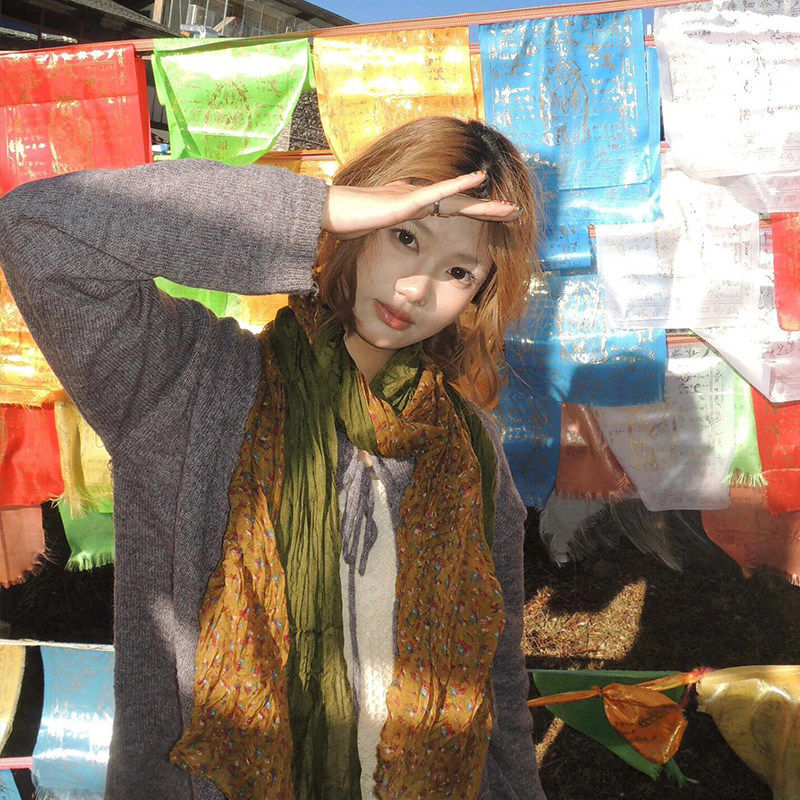 2026新款绿色长条丝巾女文艺感撞色碎花森系围巾薄款云南披肩外搭