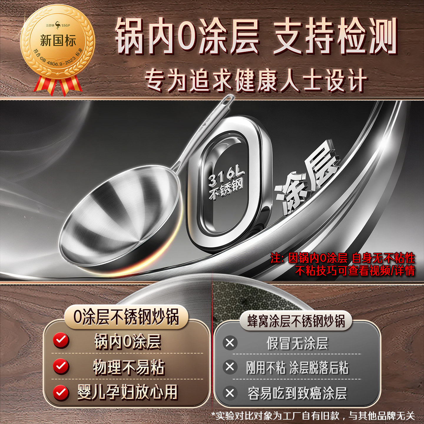 三四钢?不锈钢0涂层炒锅家用316L食品级加厚圆底炒菜锅官方正品