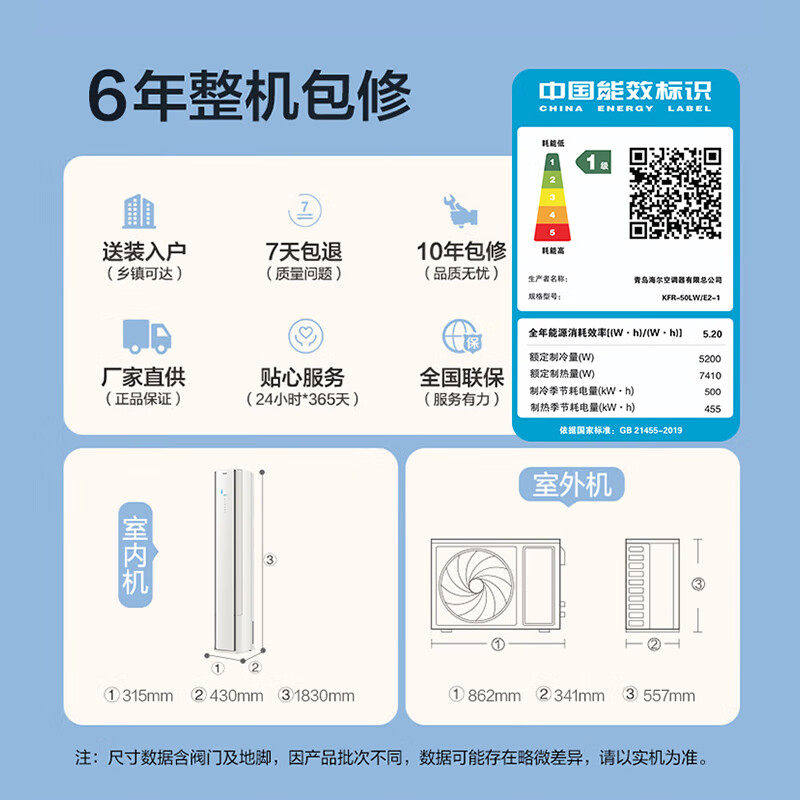 海尔舒适风2匹立式空调柜机家用变频一级能效客厅除菌冷暖两用E2
