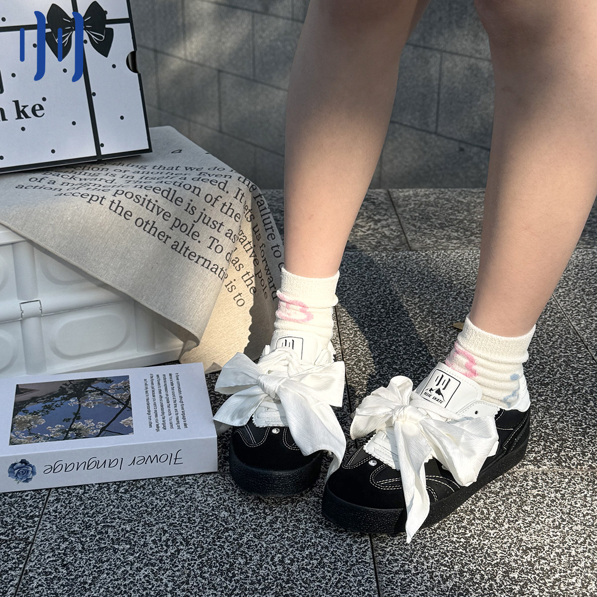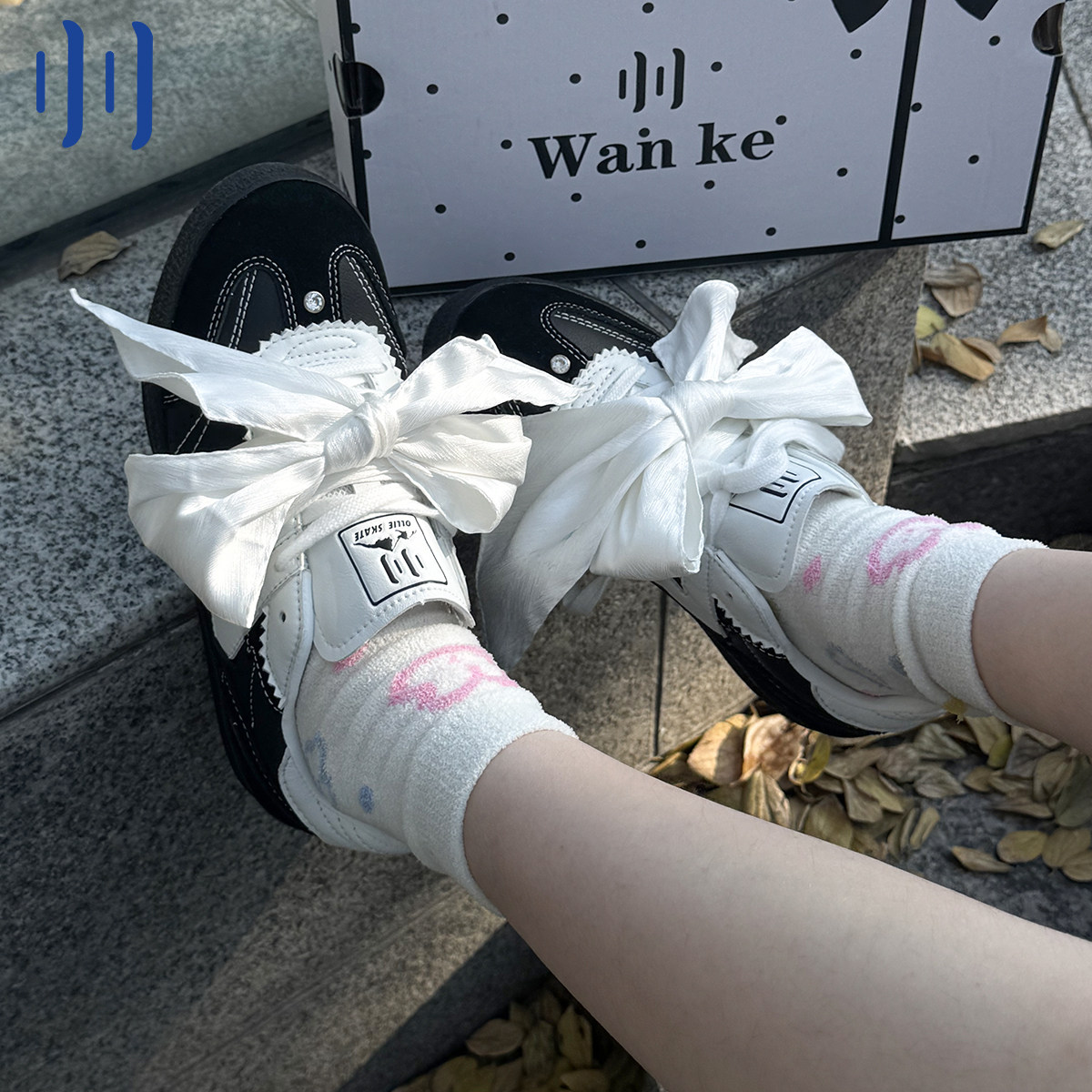 顽刻官方黑色皮质蝴蝶结丝带生胶W系列国潮男女德训滑板鞋