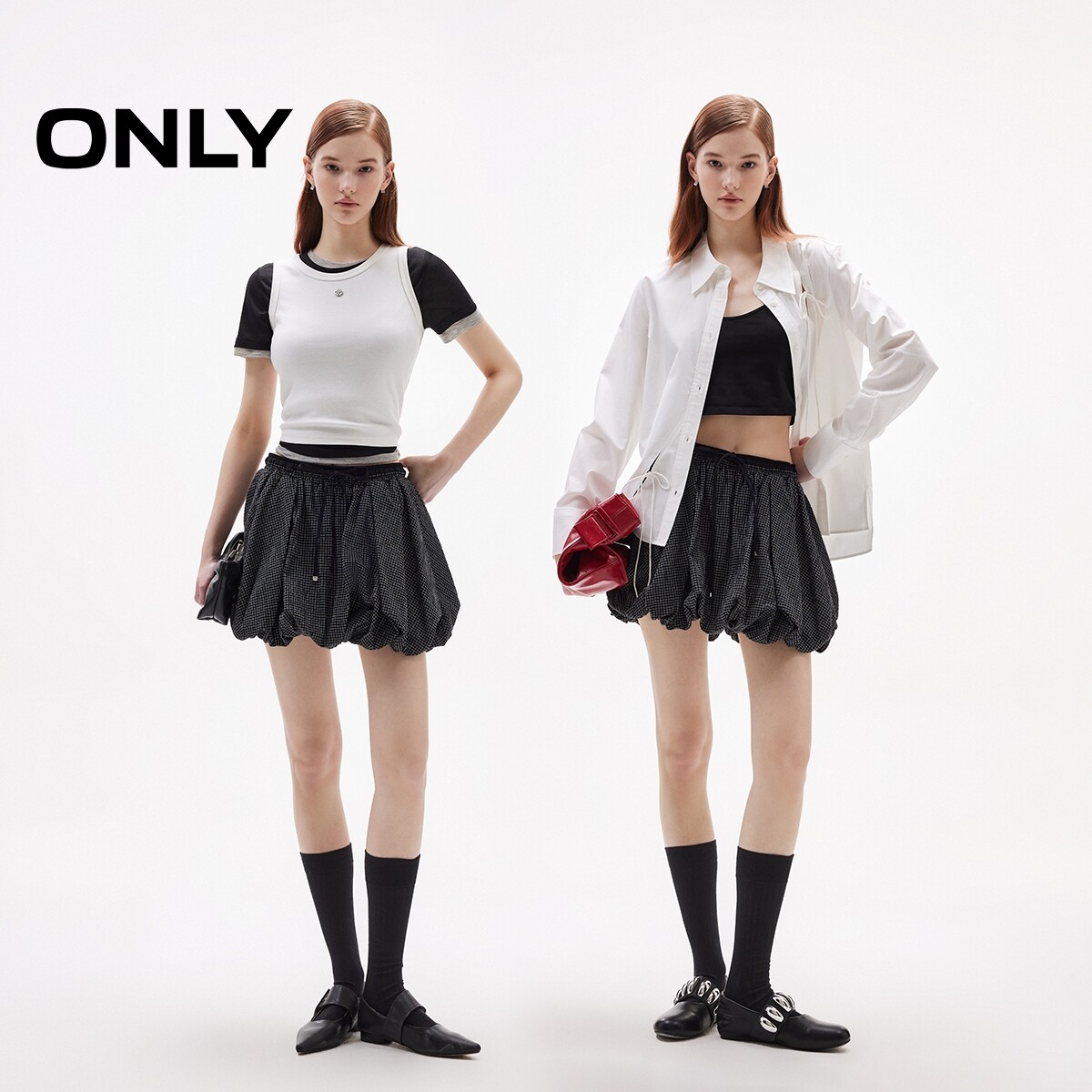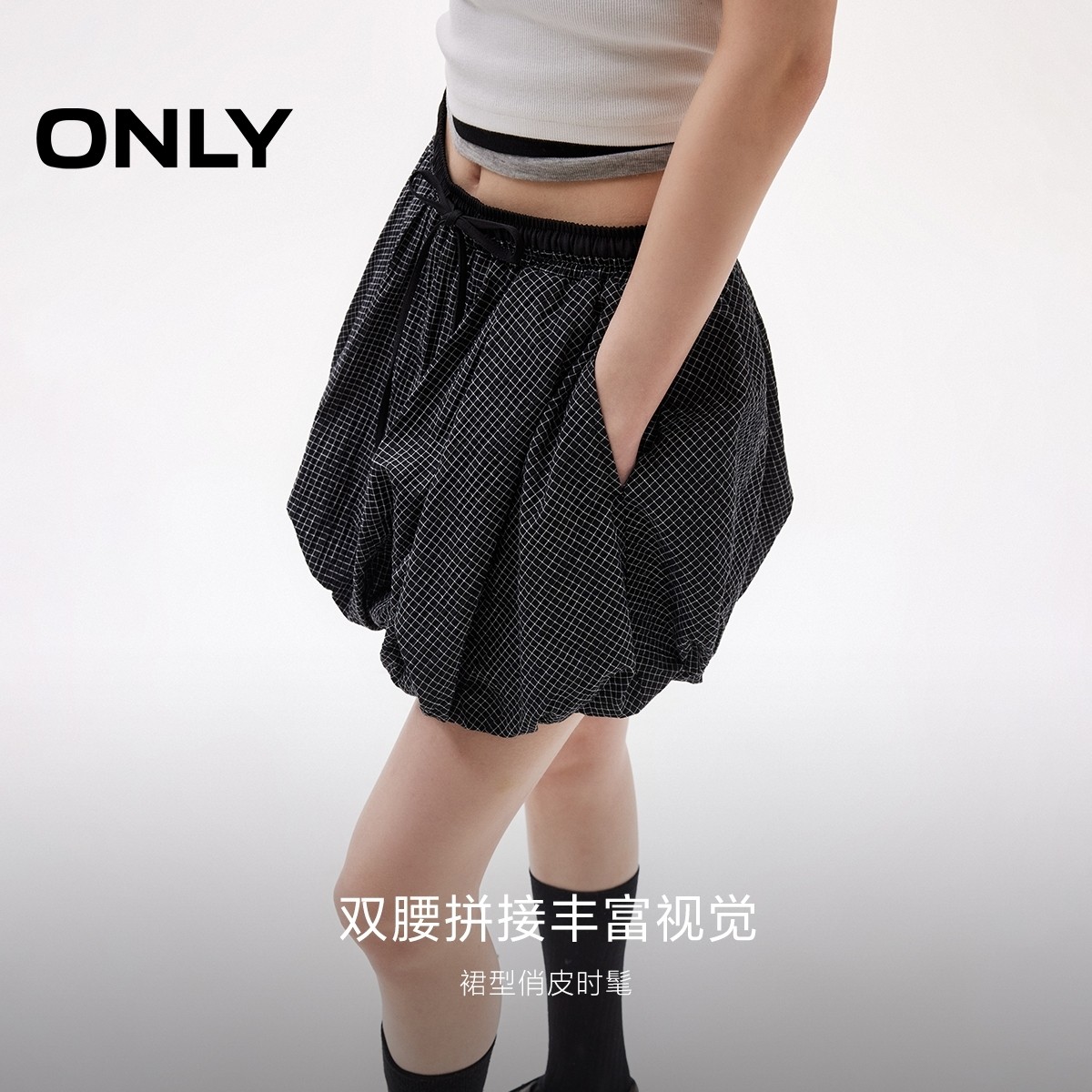 ONLY夏季复古格纹松紧腰俏皮南瓜短裙高腰花苞裙半身裙女