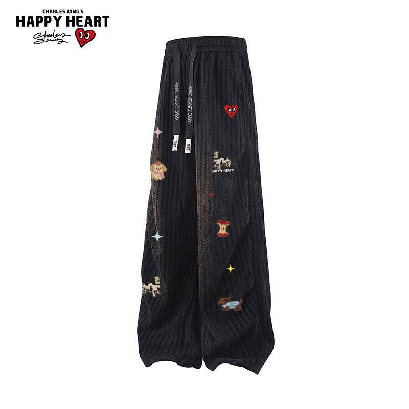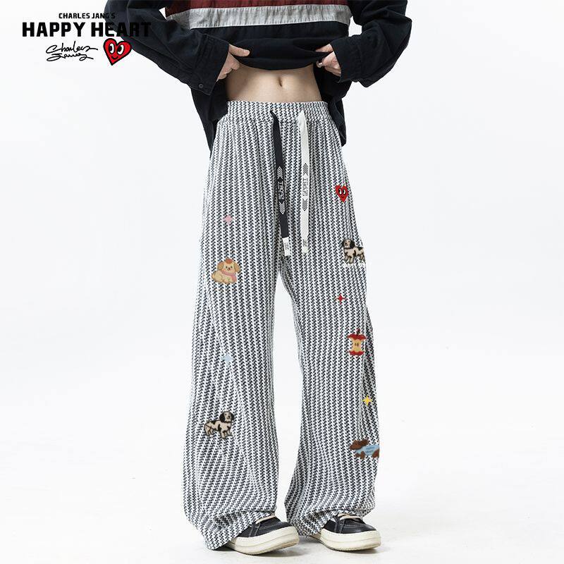 查尔斯桃心趣味印花条纹慵懒休闲裤男女春秋季新款百搭直筒长裤子