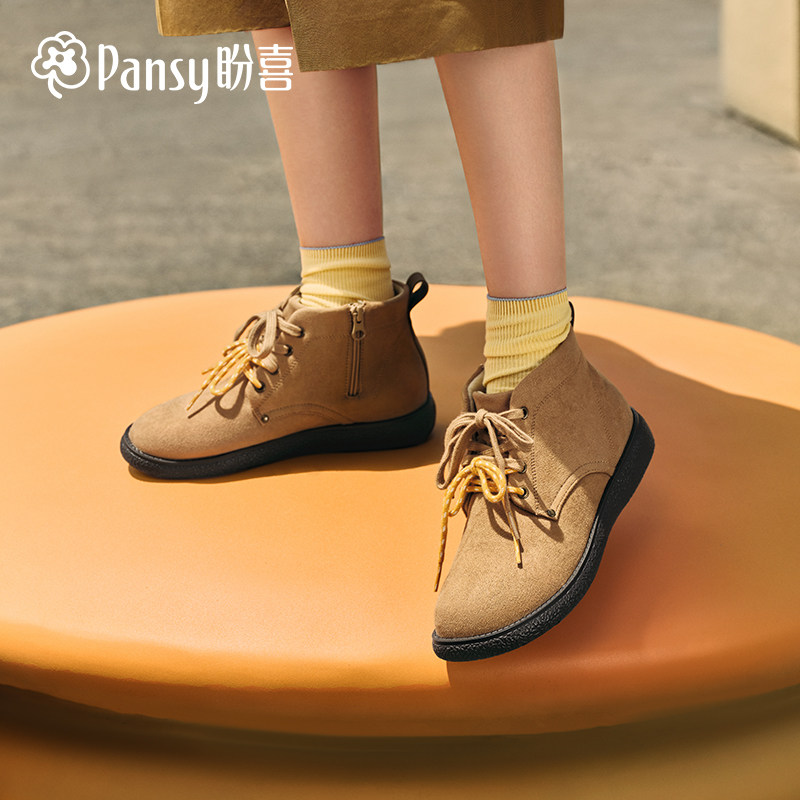 Pansy盼喜短靴女秋单靴新款休闲百搭秋冬季平底高帮鞋拉链靴子