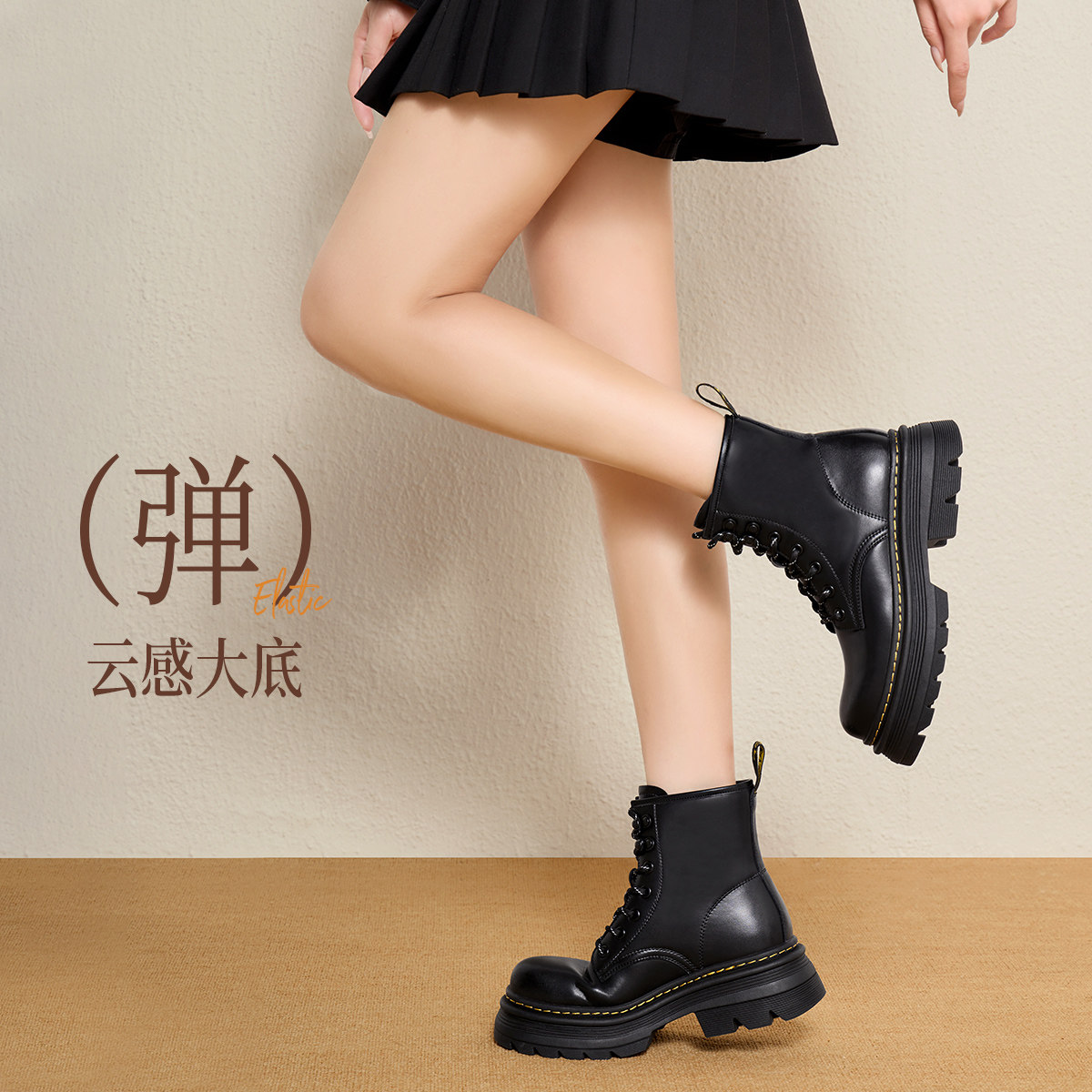 天美意厚底增高加绒英伦马丁靴大黄靴女鞋子休闲短靴皮靴冬季新款