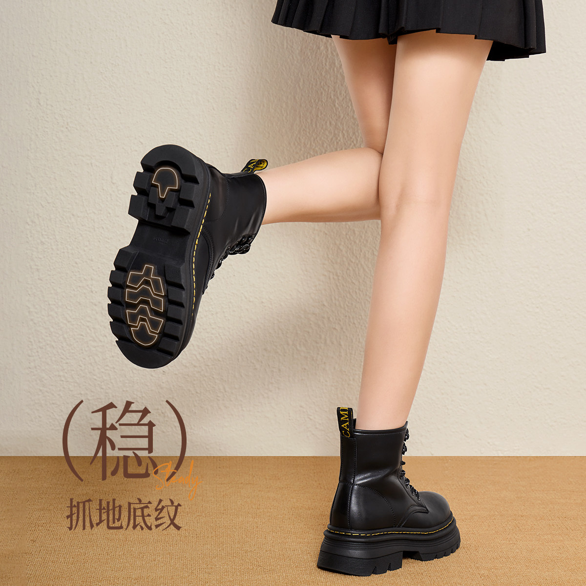 骆驼女鞋2025秋季新款真皮厚底增高机车靴黑色马丁靴女款
