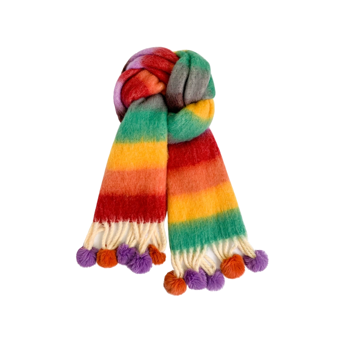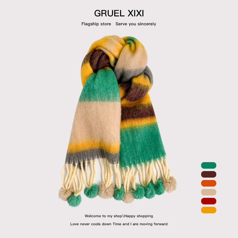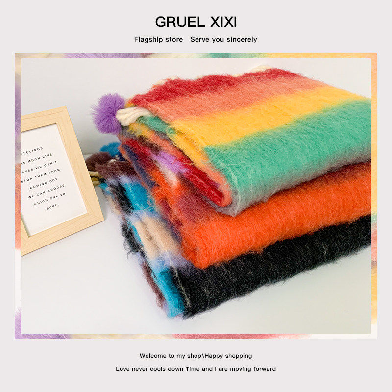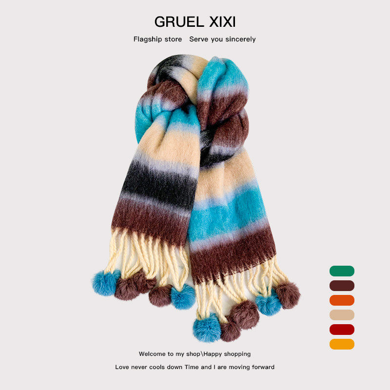 多巴胺彩虹条纹马海毛围巾女冬季软糯保暖真兔毛毛球长款披肩围脖