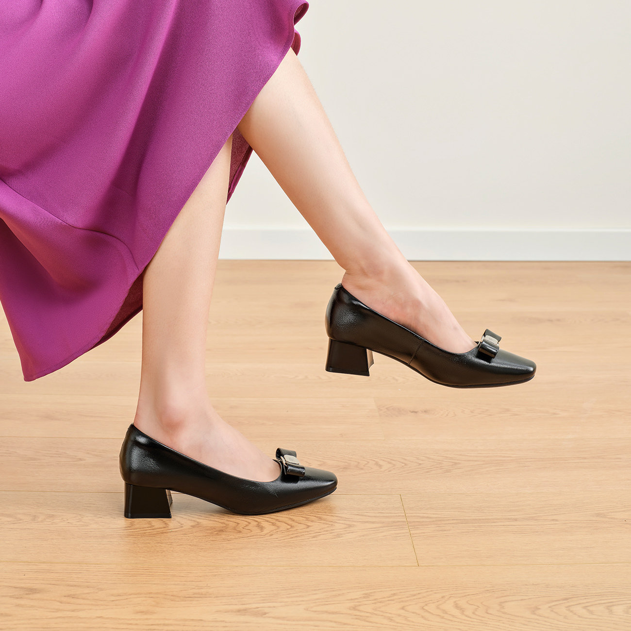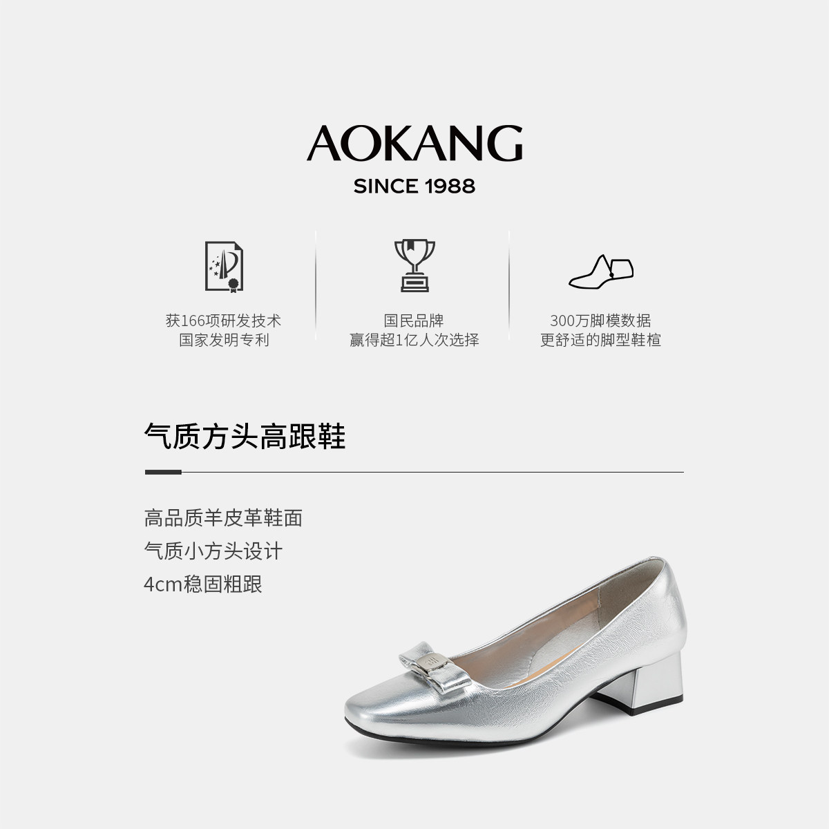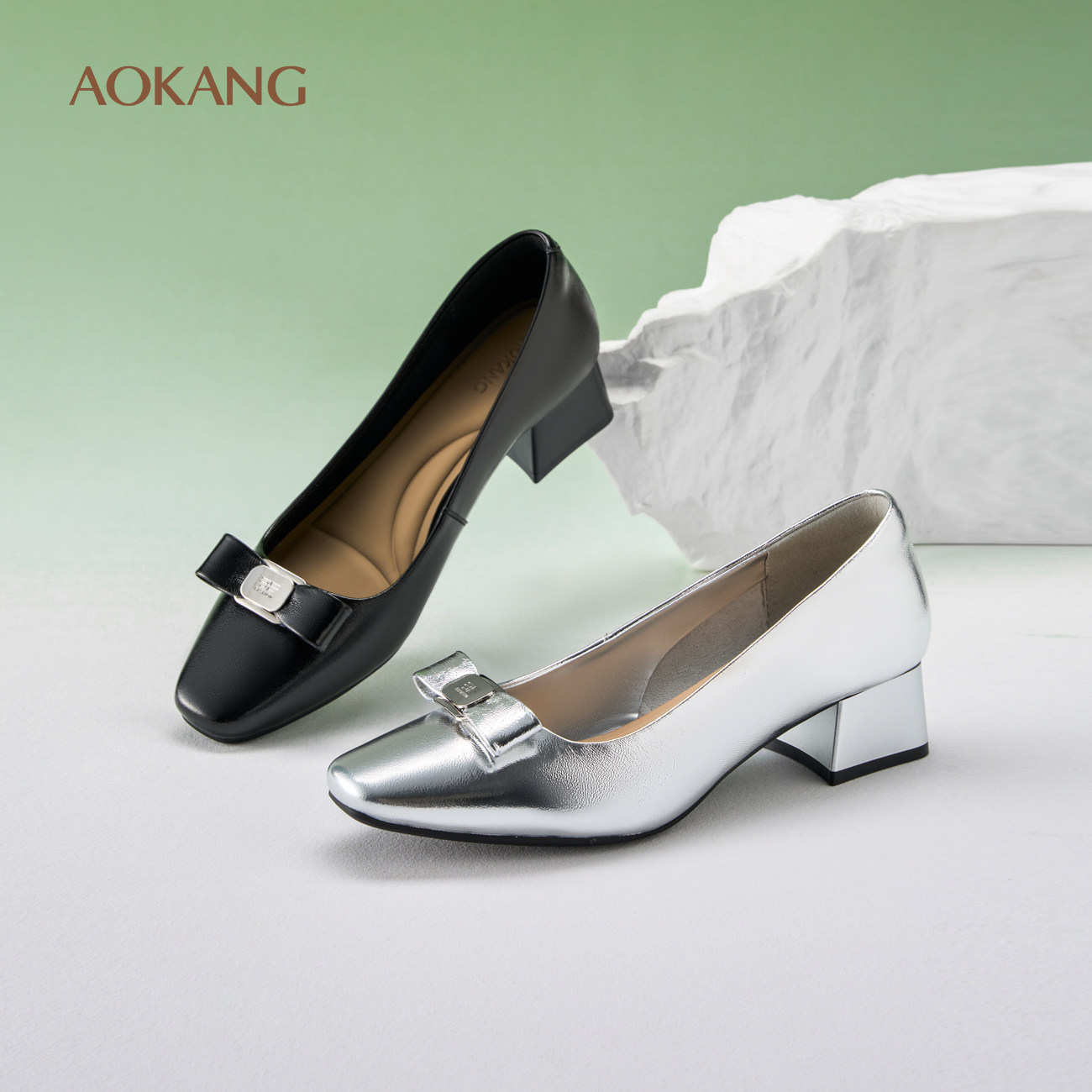 奥康 女鞋2025春秋浅口单鞋真皮小方头甜美蝴蝶结通勤中跟鞋