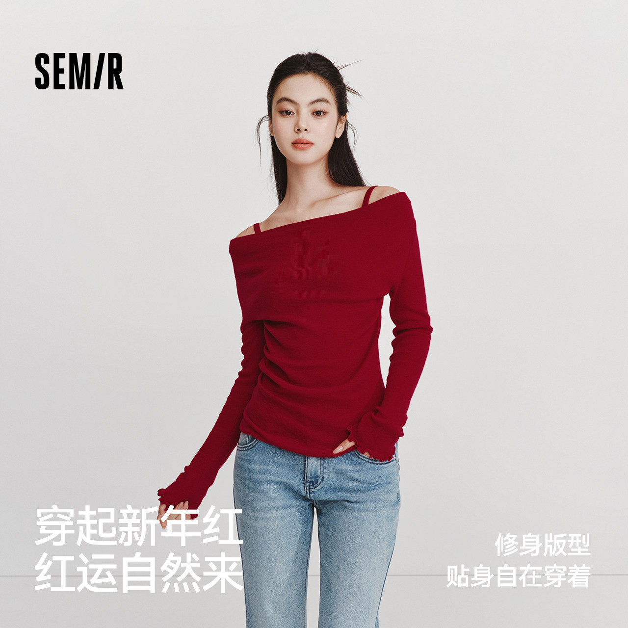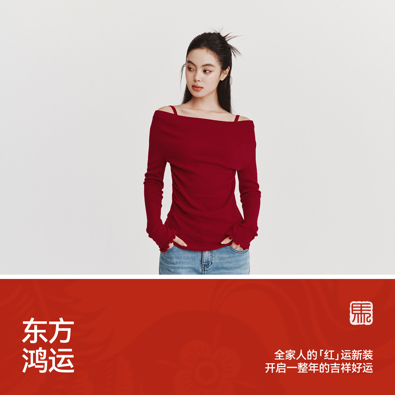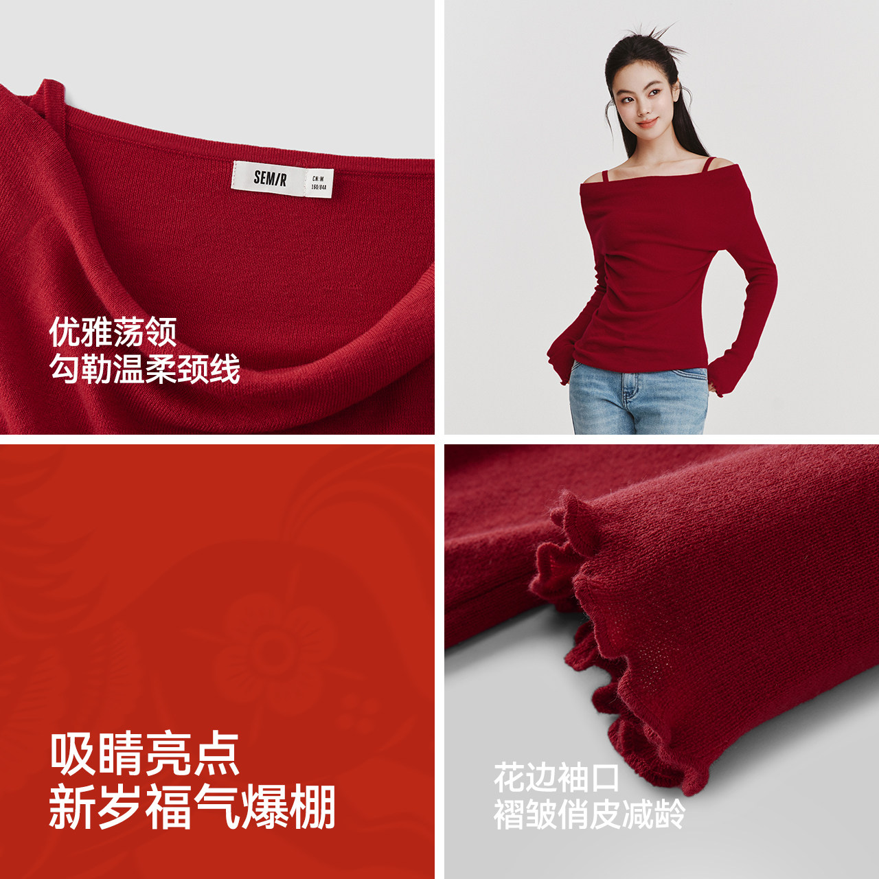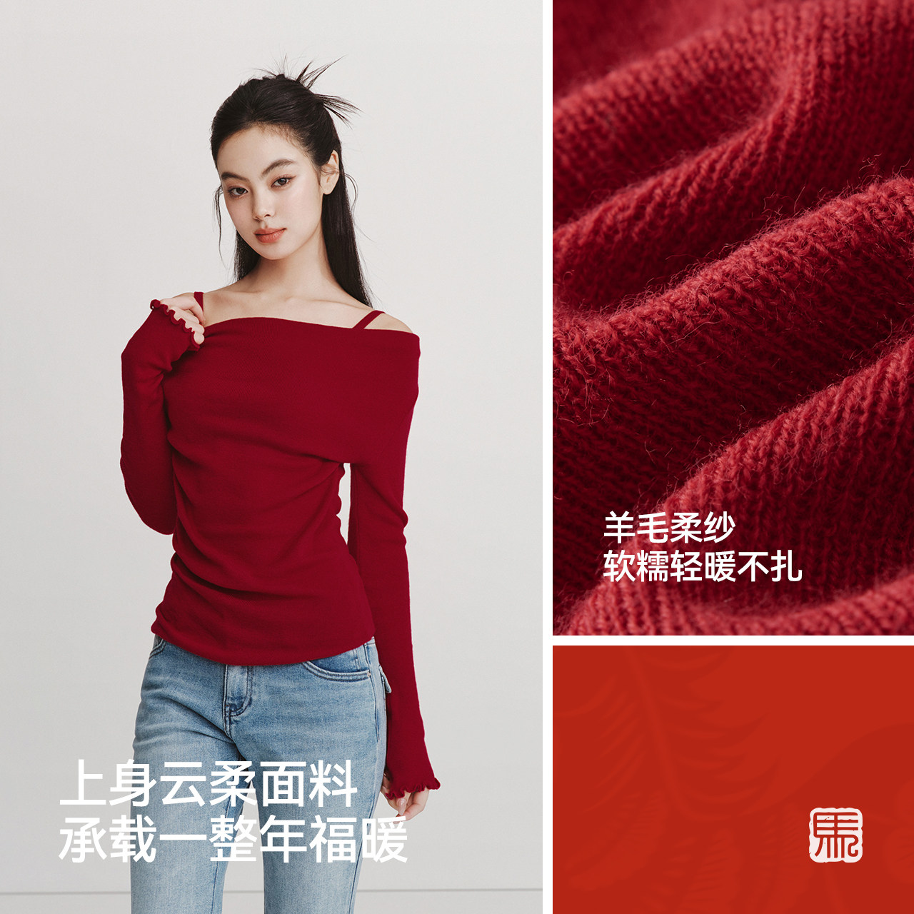 森马针织衫女春荡领假两件木耳边红色修身2026新款新年小心机衣服