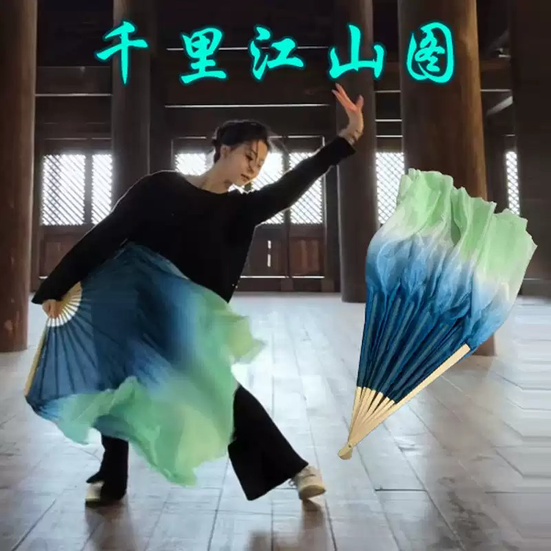 千里江山图真丝舞蹈扇扇子跳舞扇青绿胶州秧歌扇古典儿童舞蹈扇