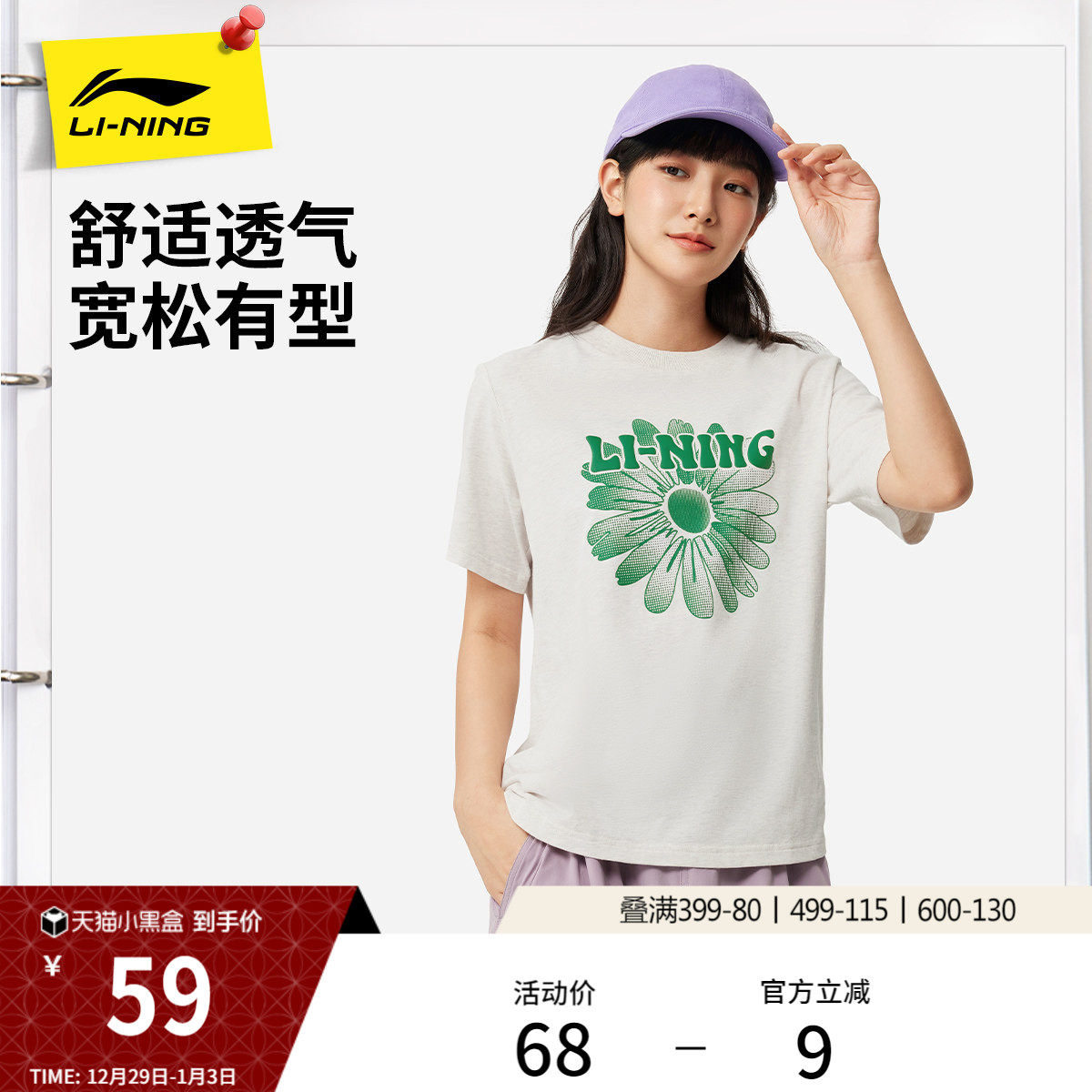李宁短袖女士夏季印花体恤吸汗舒适圆领上衣宽松半袖款运动T恤女