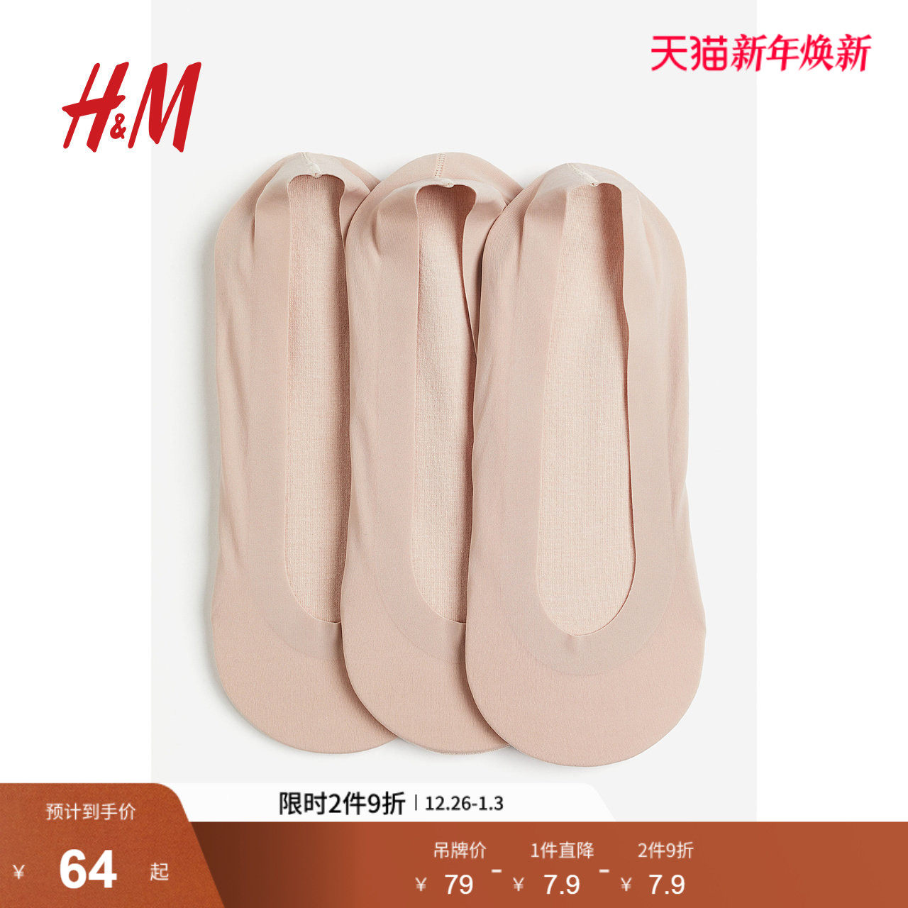 HM女士船袜3对装低裁设计细密针织棉混纺柔软防滑隐形袜1155322