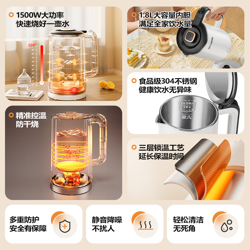 美的电热水壶养生壶家用烧水壶玻璃办公室小型不锈钢保温炖煮一体