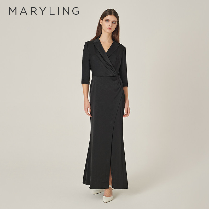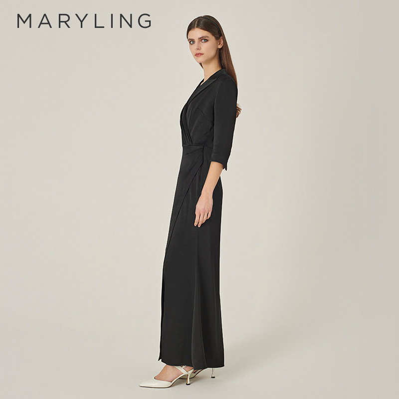 MARYLING玛俪琳初秋新品黑色翻尖领中袖礼服裙A1EFW68050
