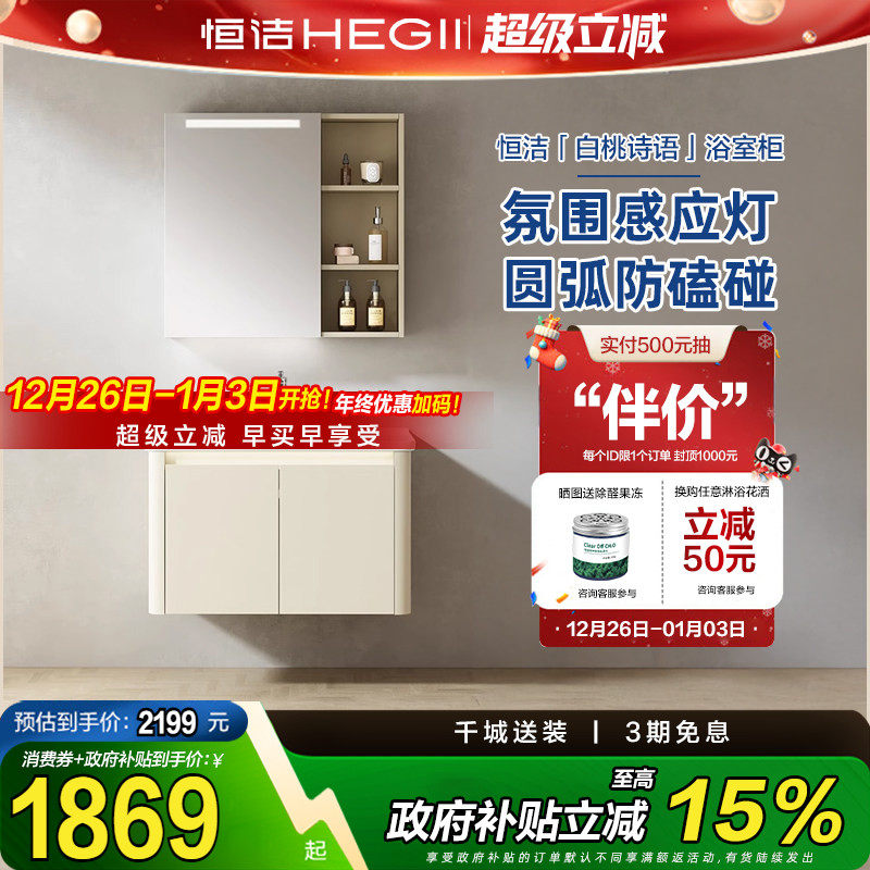 恒洁浴室柜卫生间奶油风陶瓷一体盆洗手盆组合柜智能镜柜套装6248