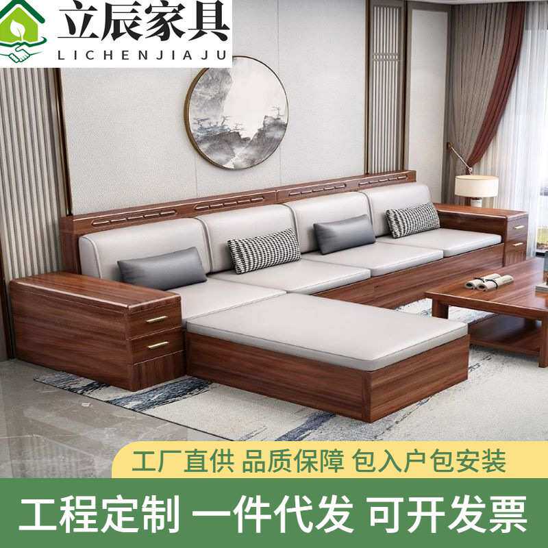 新中式胡桃木实木沙发转角贵妃组合大小户型冬夏两用储物客厅家具