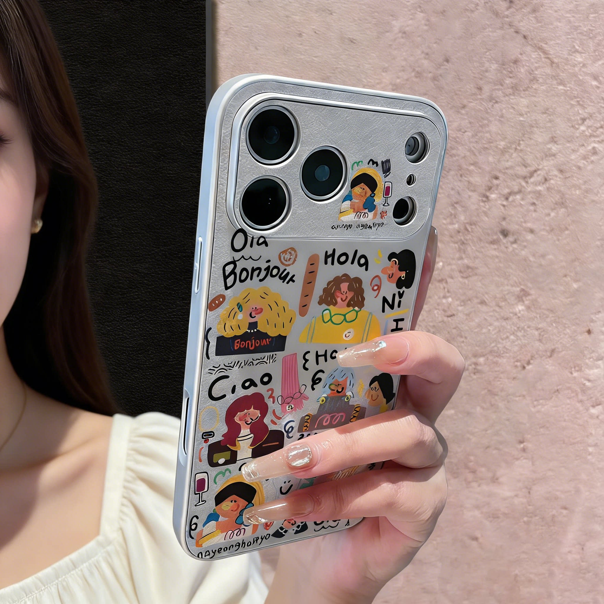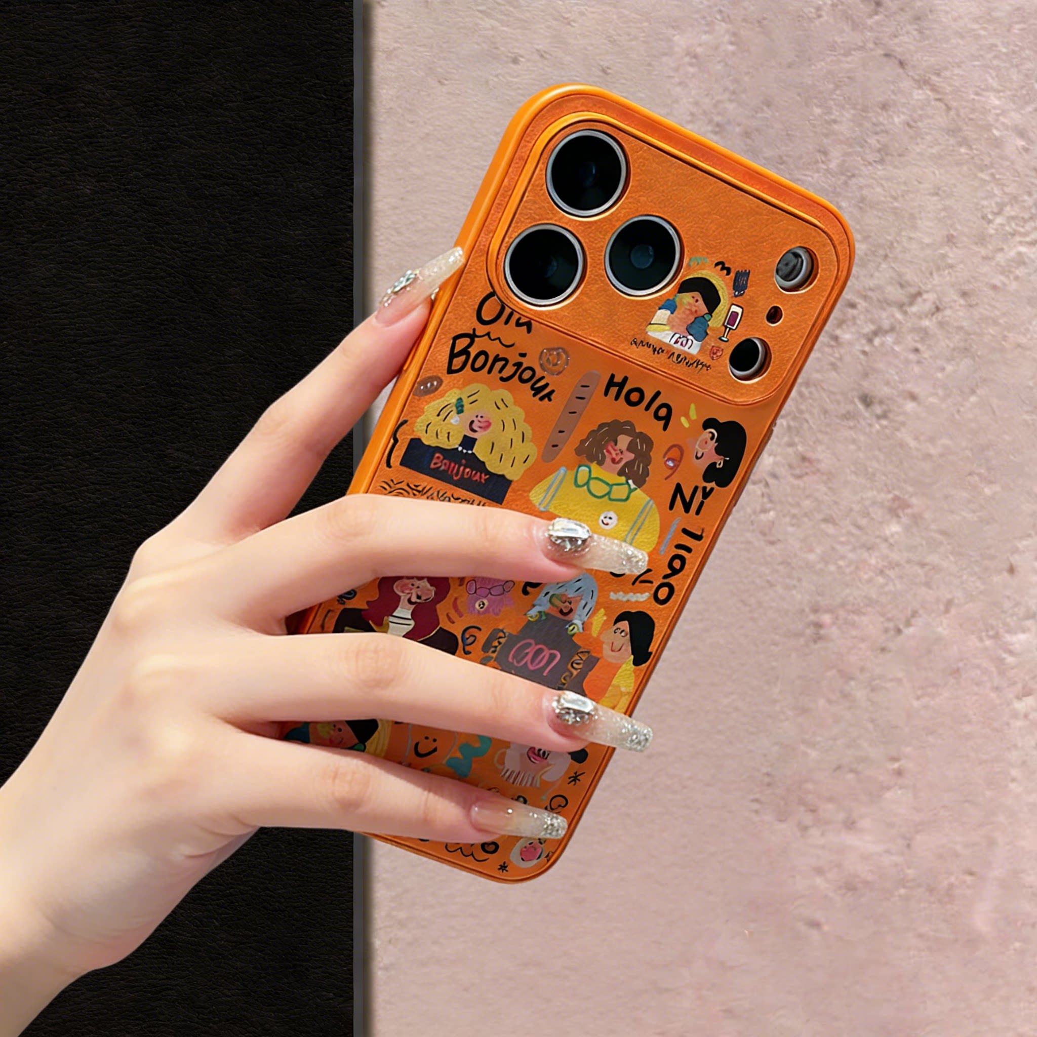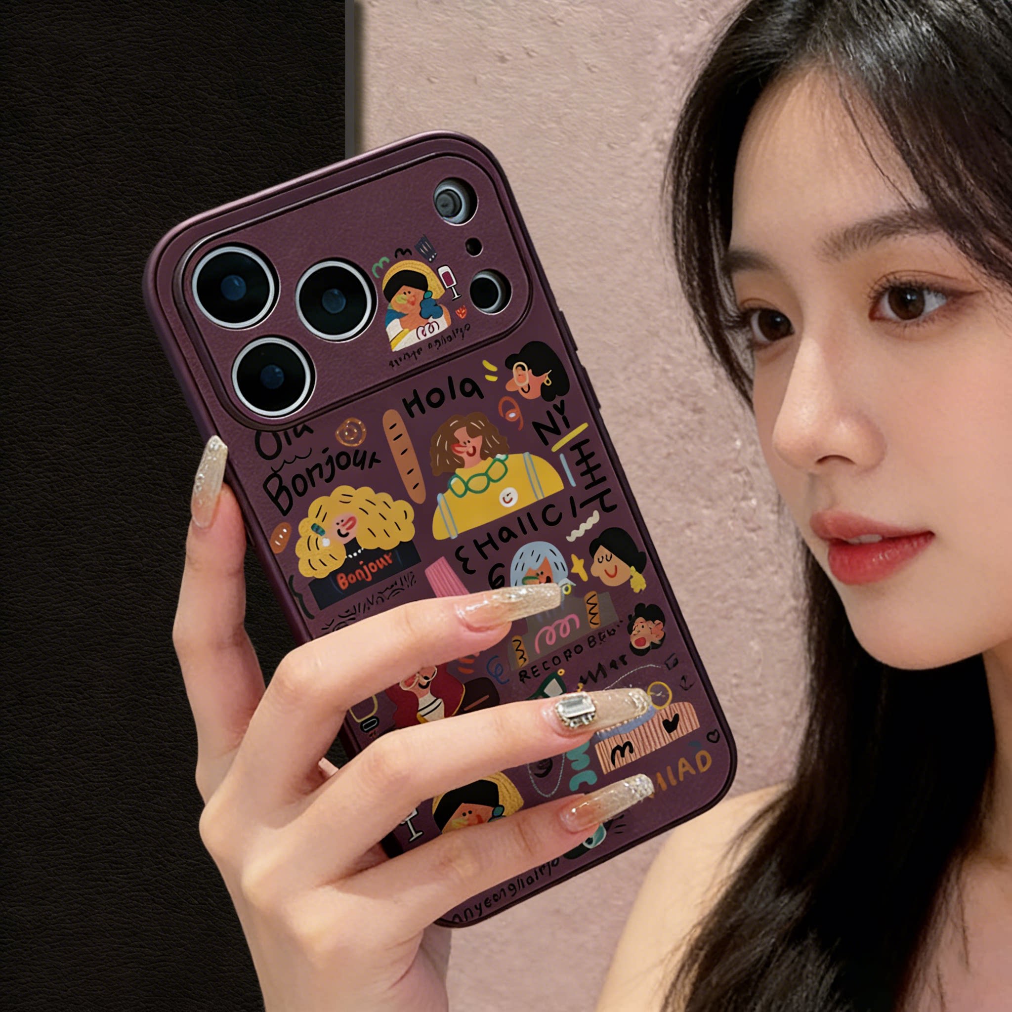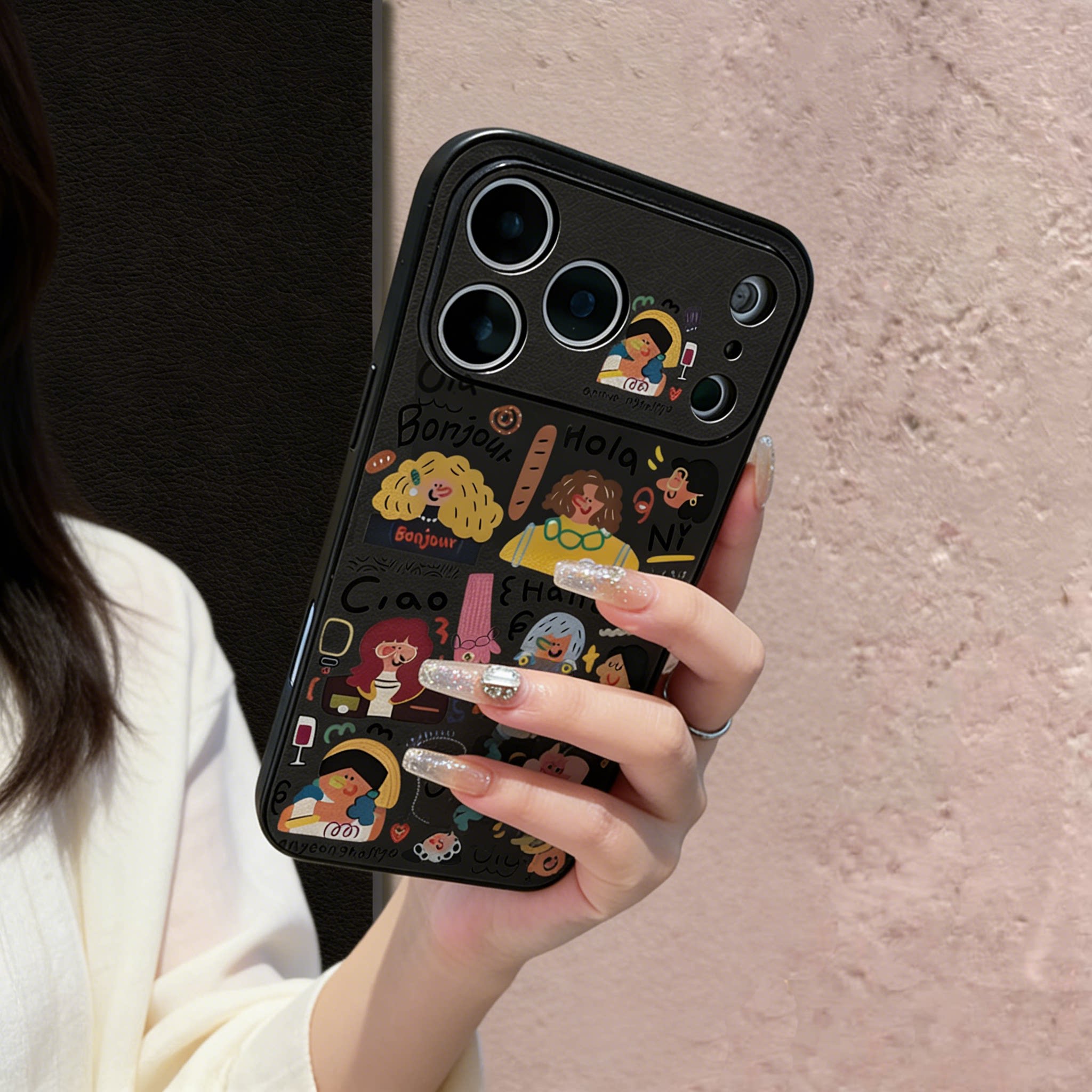 彩色头发女孩小羊皮适用苹果17promax手机壳新款iphone16pro可爱秋冬15女高级感14por全包13涂鸦皮纹12防摔套