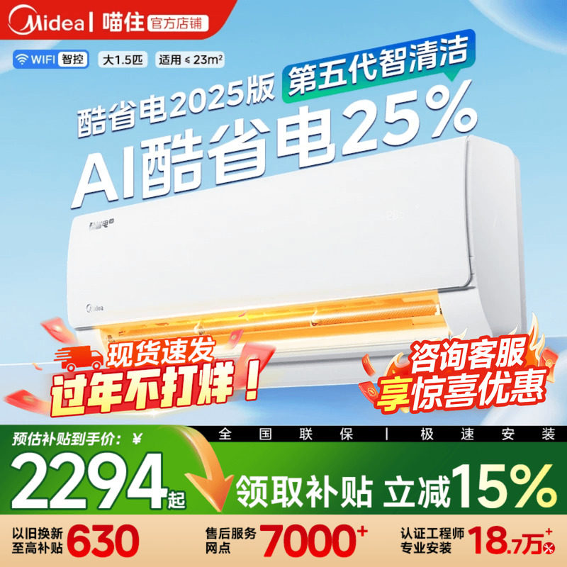 【国补15%】美的1.5匹酷省电空调家用新一级能效变频冷暖卧室挂机