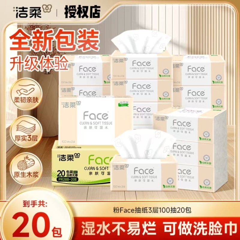 洁柔粉抽纸3层100抽20包家用实惠大包可湿水面巾纸家用抽纸