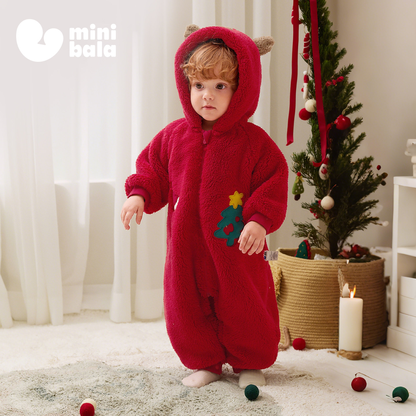 迷你巴拉巴拉婴儿衣服宝宝睡衣家居保暖珊瑚绒红色新年连体衣爬服
