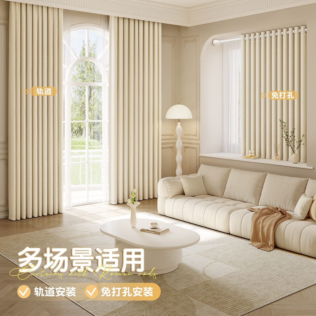 卧室窗帘全遮光遮阳加厚防晒2025新款飘窗挂钩式高级感窗户隔热布