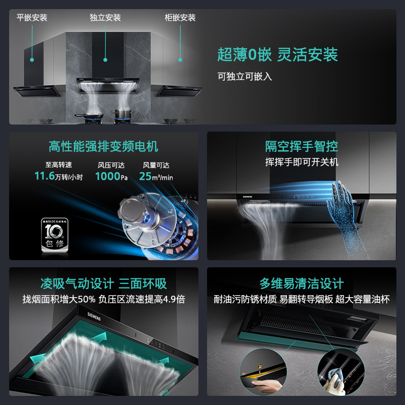 西门子侧吸抽油烟机变频大吸力25大吸力易清洁设计LS29A4EB9W