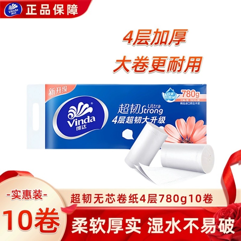 维达纸巾无芯卷纸超韧4层10卷家用卫生纸实芯卷筒纸厕纸手纸提装