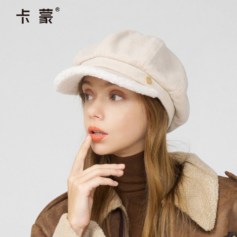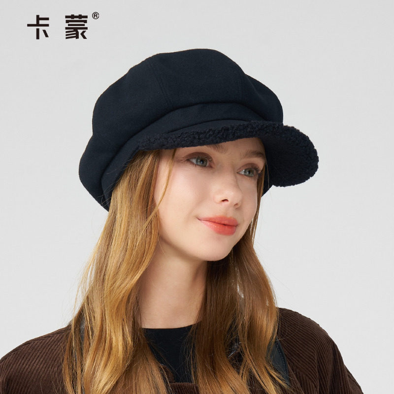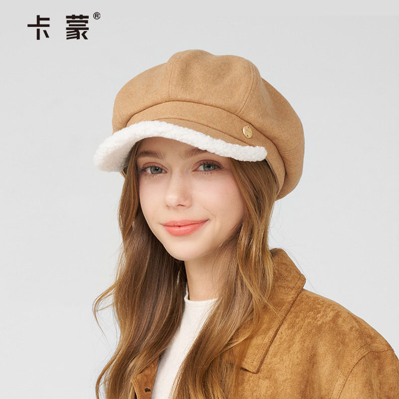 卡蒙山羊绒羊毛云朵八角贝雷帽女秋冬大头围羊毛呢保暖毛绒画家帽