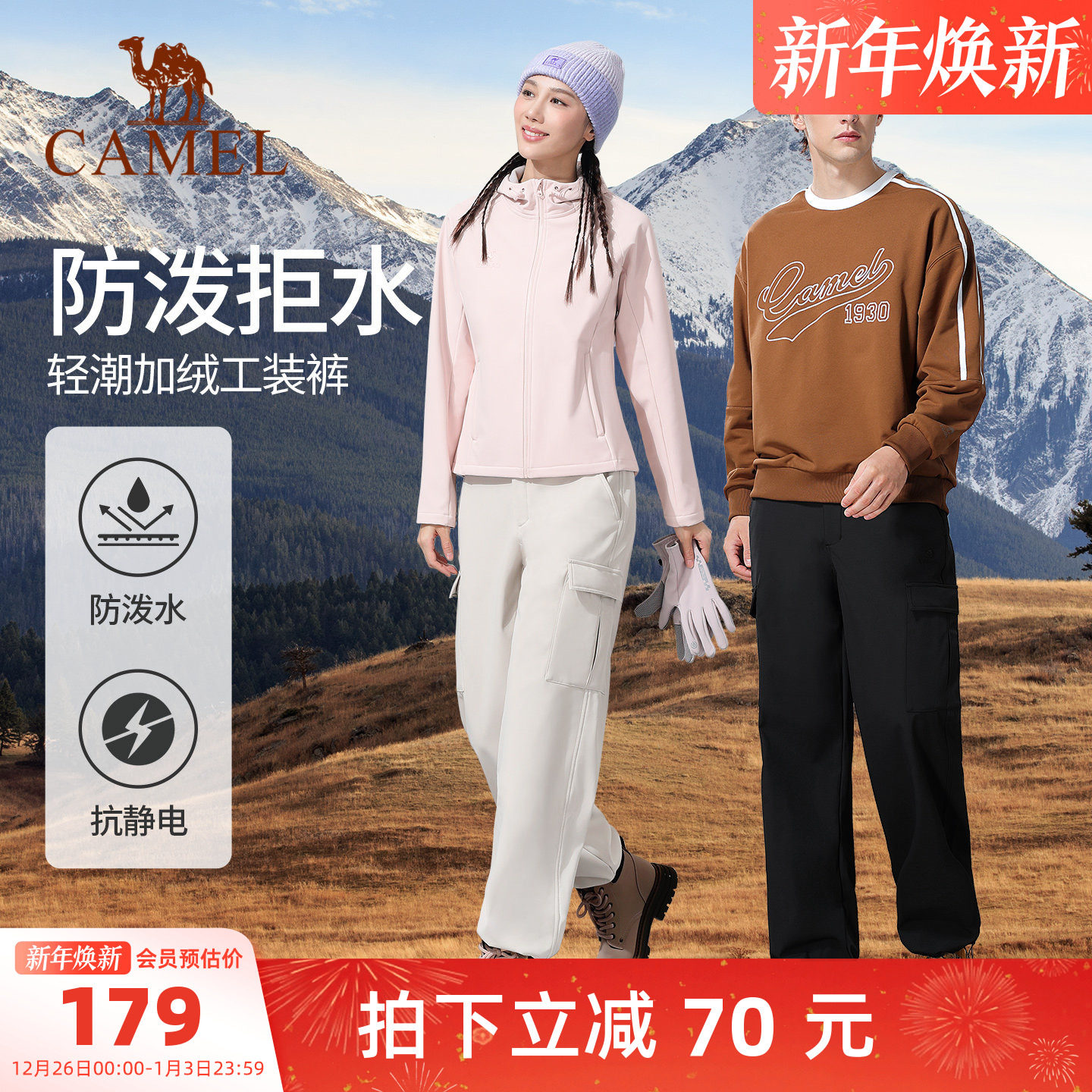 骆驼工装裤男女款秋冬季时尚户外运动裤防泼加绒登山防风冲锋长裤