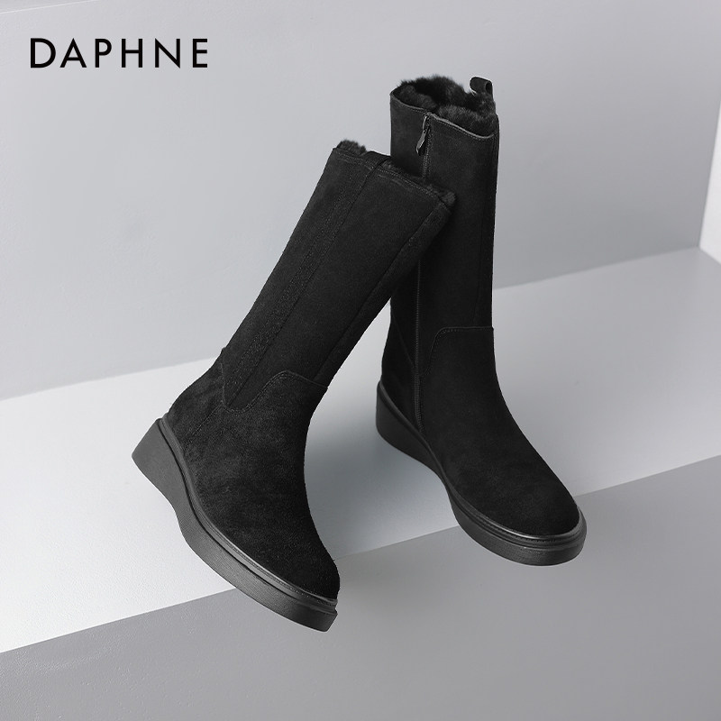 达芙妮雪地靴女2026新款冬季加绒加厚靴子黑色坡跟中筒保暖棉靴女