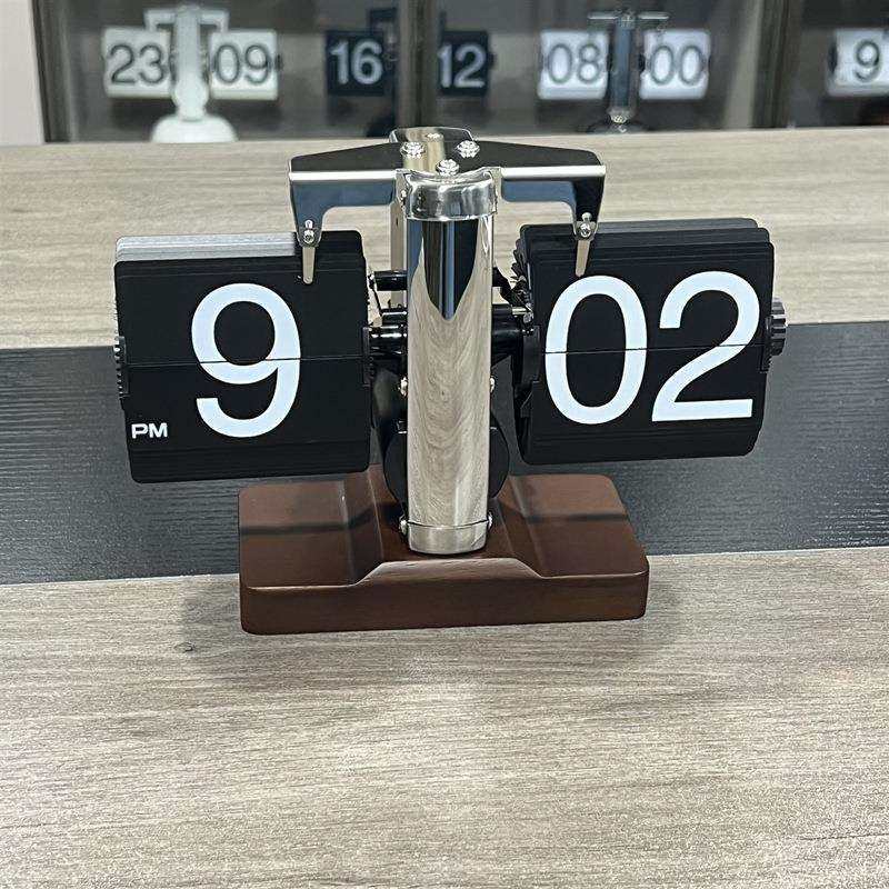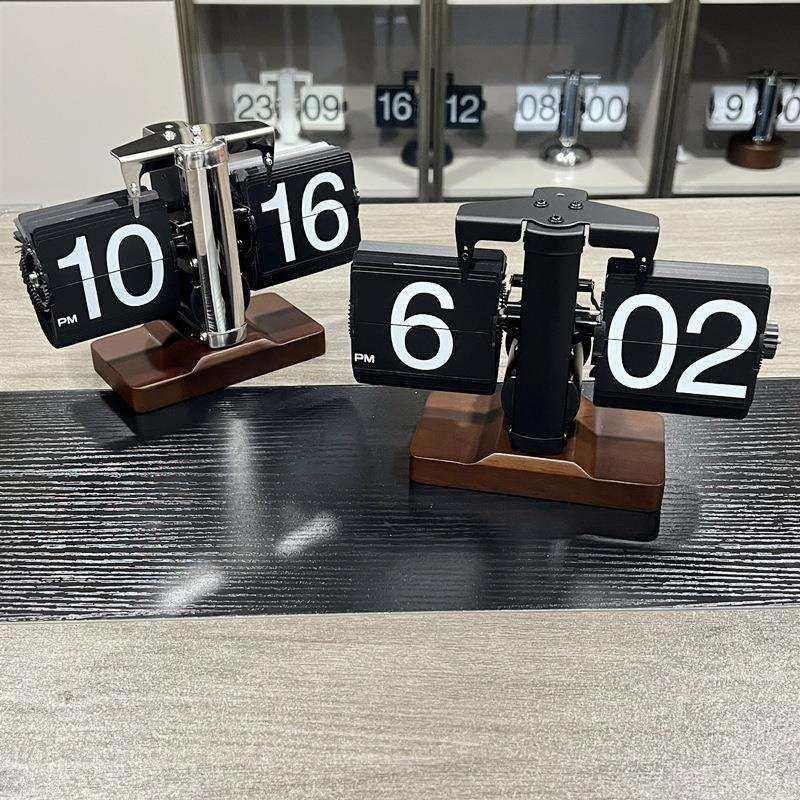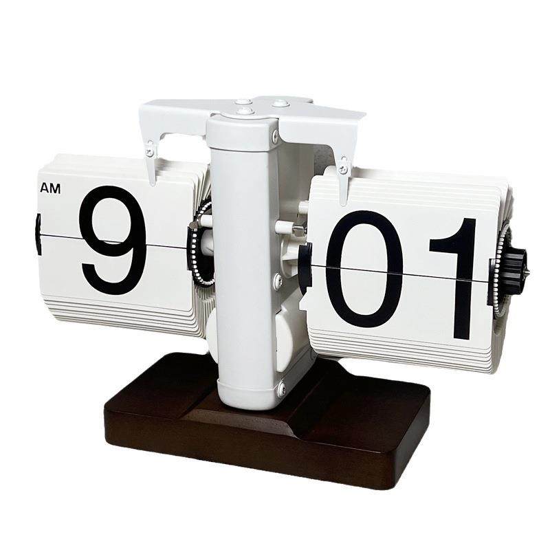 妙刻家用复古机械翻页时钟桌面自动闹钟实木底座工厂台钟摆件座式