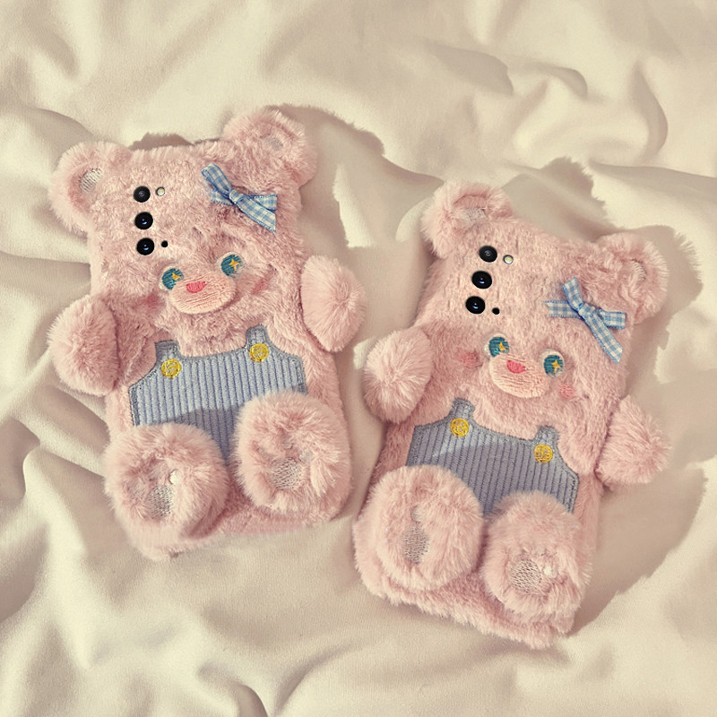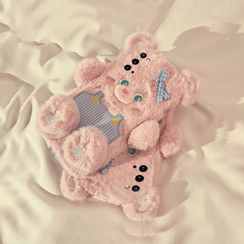 手机壳秋冬毛绒可爱卡通背带裤小熊