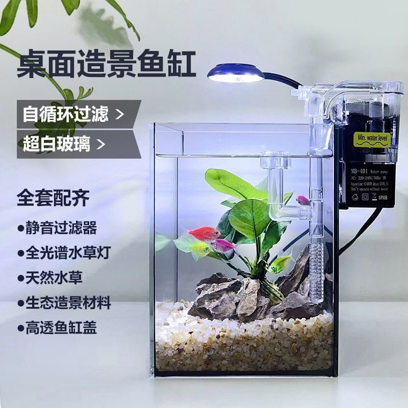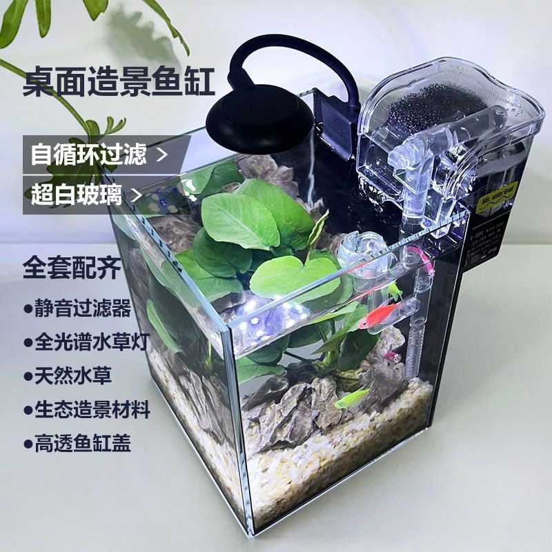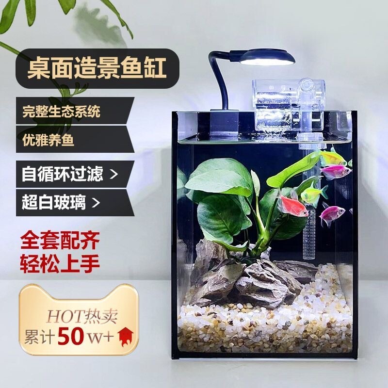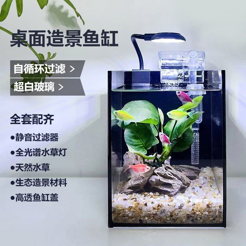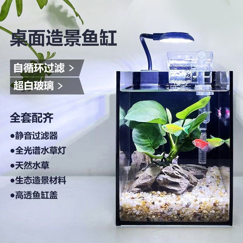 桌面造景小鱼缸办公桌免换水超白玻璃直角缸网红黑背景斗鱼鱼缸