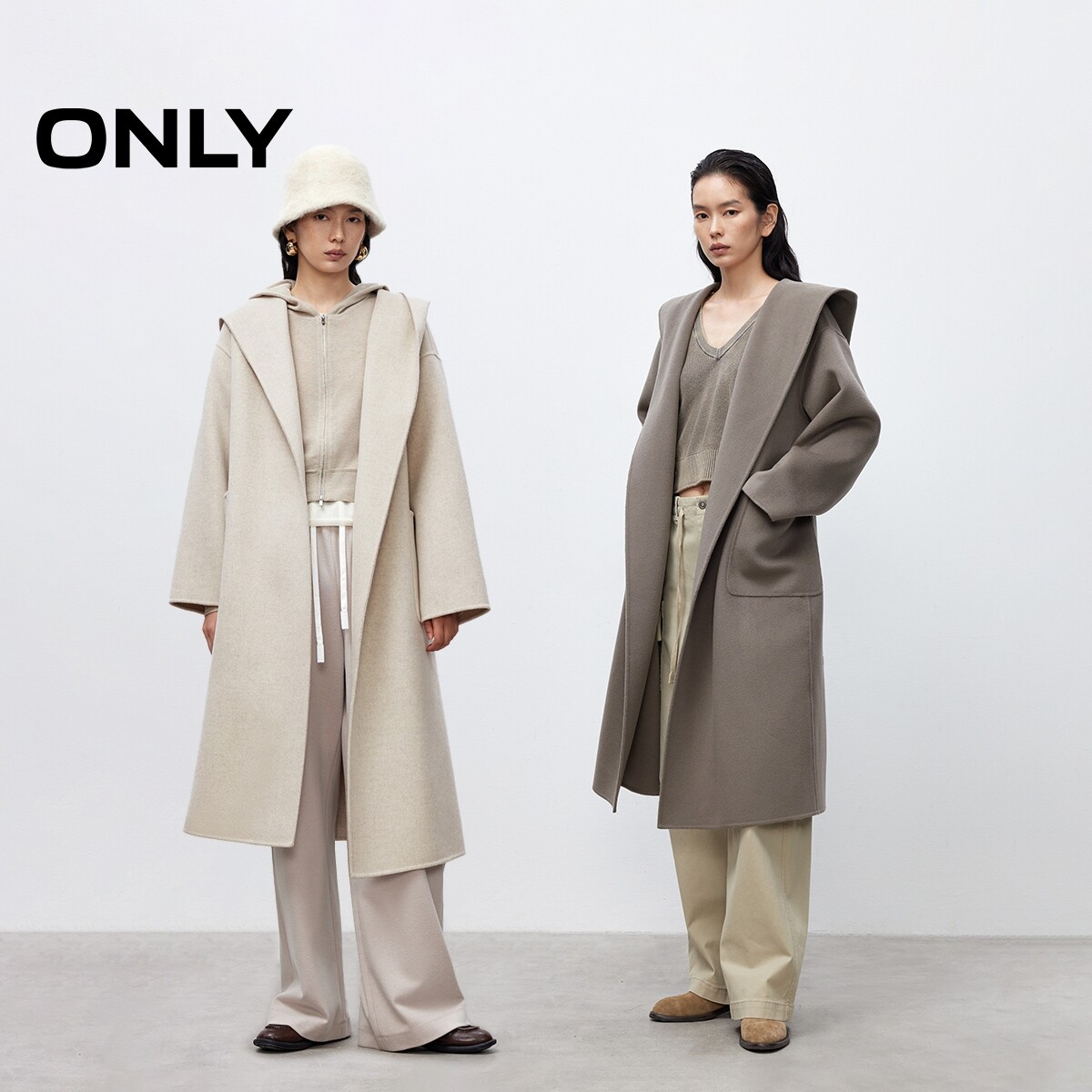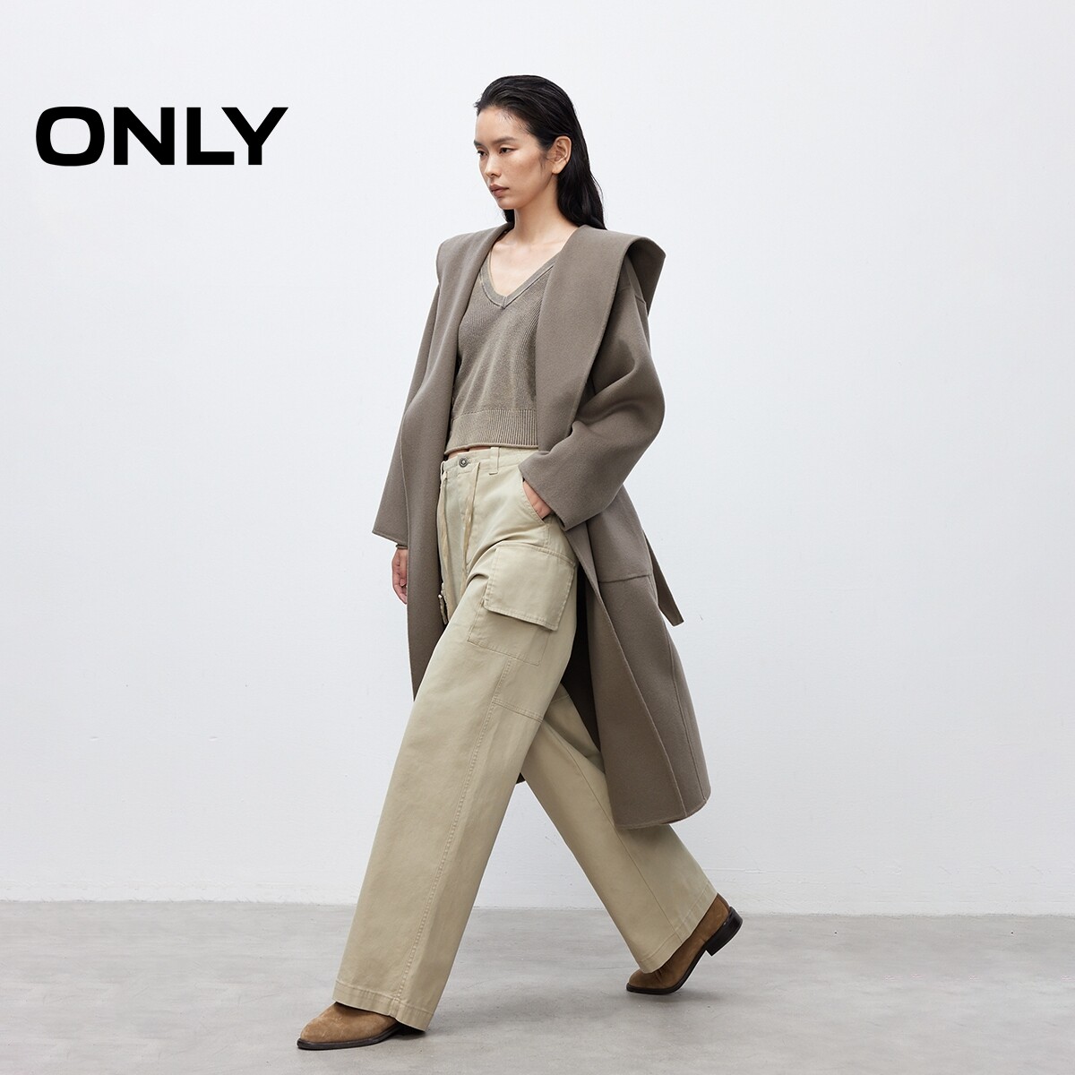 【ONLY奥莱】春款大容量贴袋含羊毛双面呢连帽中长款毛呢大衣女
